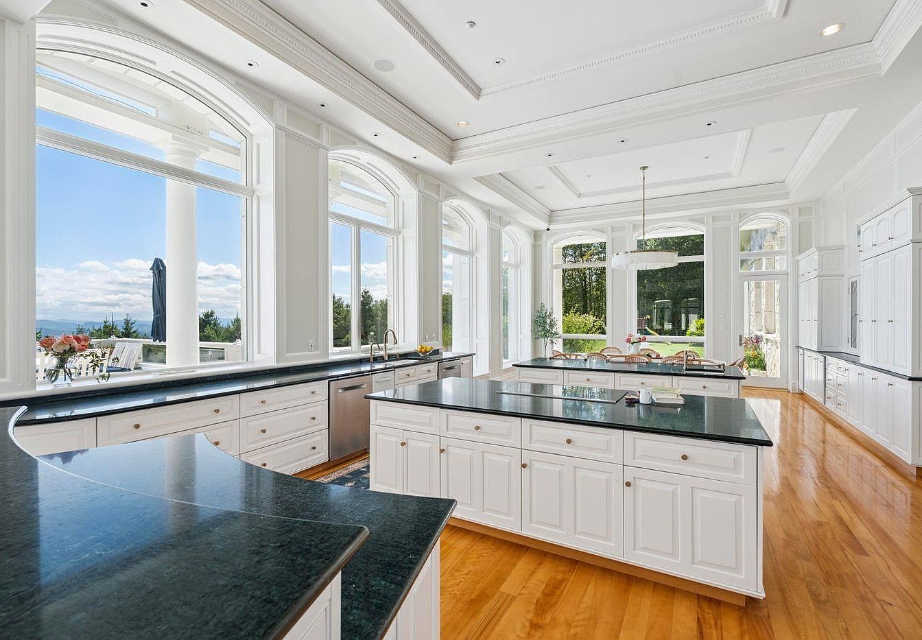Featuring an exquisite open layout, this kitchen harmoniously blends functionality with luxury. Gleaming dark granite countertops contrast beautifully against the pristine white cabinetry, creating a bright, inviting atmosphere. Large, arched windows flood the area with natural light, offering stunning views of the outdoor landscape. The spacious central island serves both as a cooking space and a casual dining area, ideal for family gatherings. Elegant crown moldings accentuate the high ceilings, while polished hardwood floors add warmth. Thoughtful design elements, such as ample storage and modern appliances, ensure this kitchen is both practical and stylish for any culinary enthusiast.