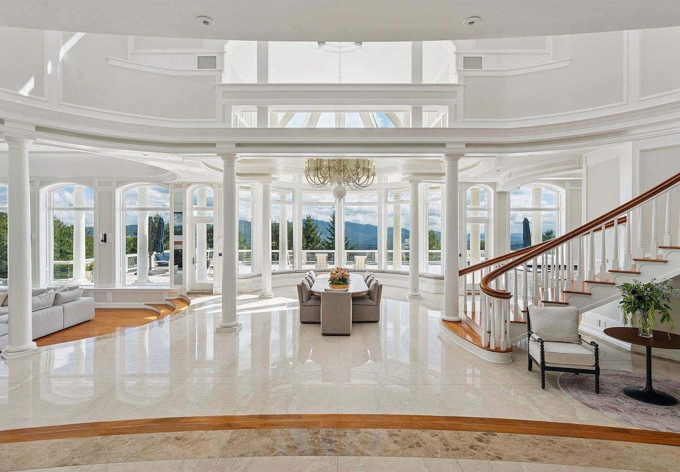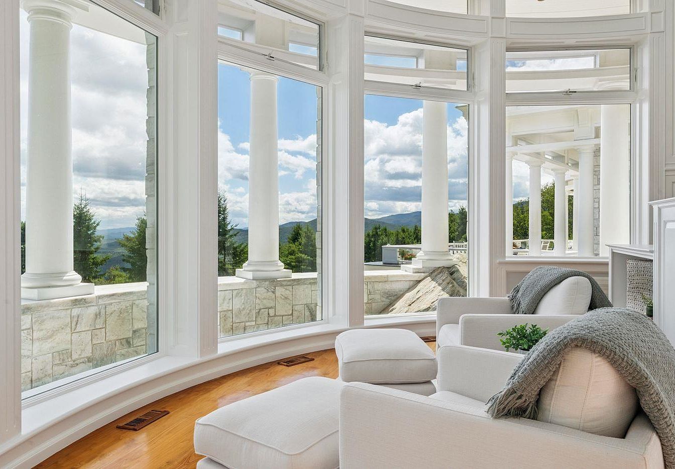 This sunroom features an expansive curved wall of windows that offers breathtaking panoramic views of the surrounding landscape. Natural light floods the space, accentuating the high ceilings adorned with elegant architectural details. Plush, white armchairs and cozy throws create a serene and inviting atmosphere, perfect for family gatherings or quiet relaxation. The warm wooden flooring contrasts beautifully with the crisp white trim, enhancing the room’s airy feel. Decorative elements, such as potted plants, bring a touch of greenery, bridging the indoor retreat with the stunning outdoor vistas. This harmonious blend of comfort and style makes it an inspiring space.