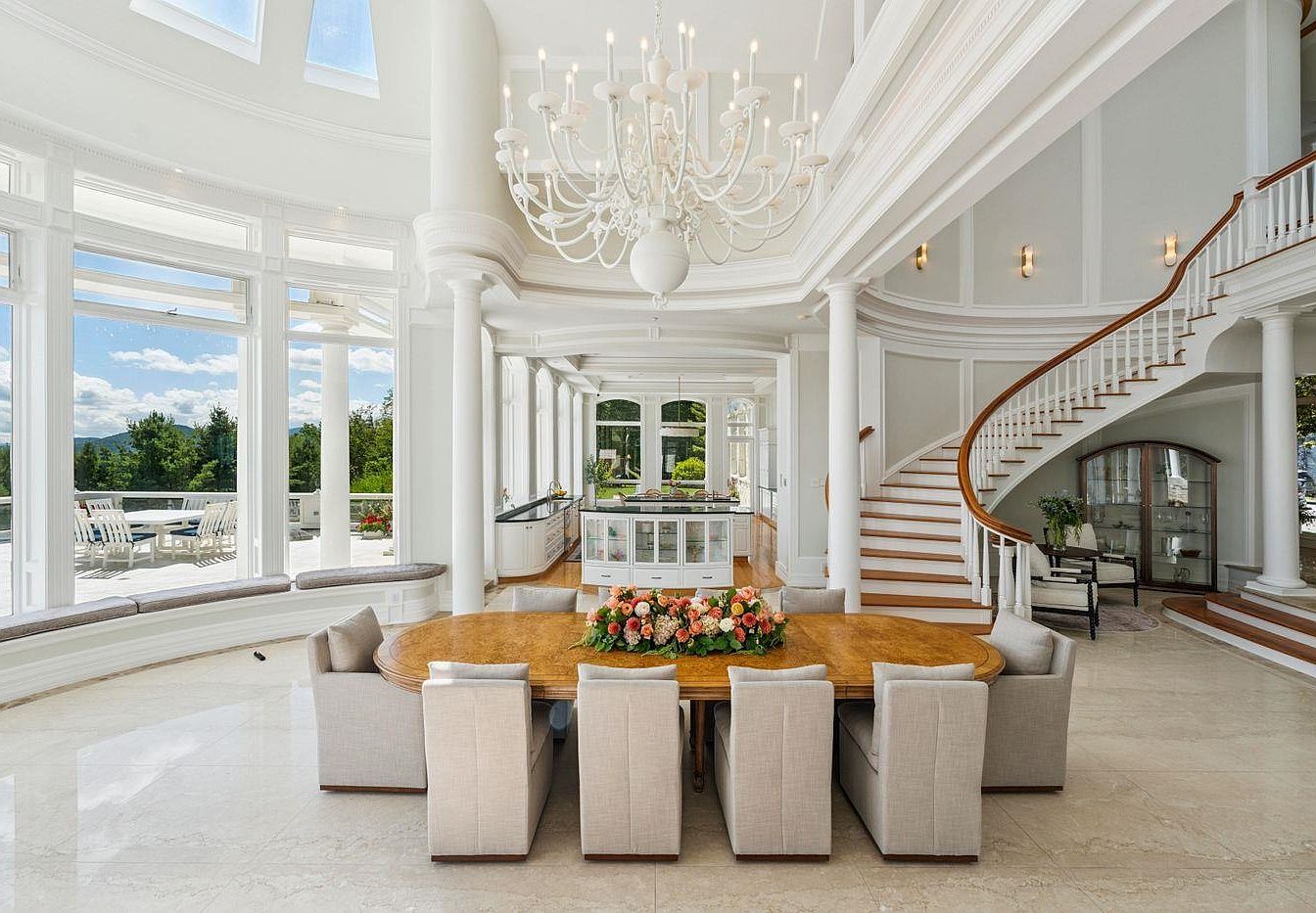This spacious dining area features an elegantly crafted round table surrounded by plush, light-colored chairs, inviting family gatherings and entertaining. Soaring ceilings adorned with a grand chandelier enhance the airy ambiance, while the large, arched windows capture stunning views of the outdoors, allowing natural light to flood the space. The neutral color palette of soft whites and creams complements the marble flooring, adding a touch of luxury. The intricate architectural details, including columned accents and a sweeping staircase, create a captivating focal point that seamlessly blends functionality with sophisticated design.