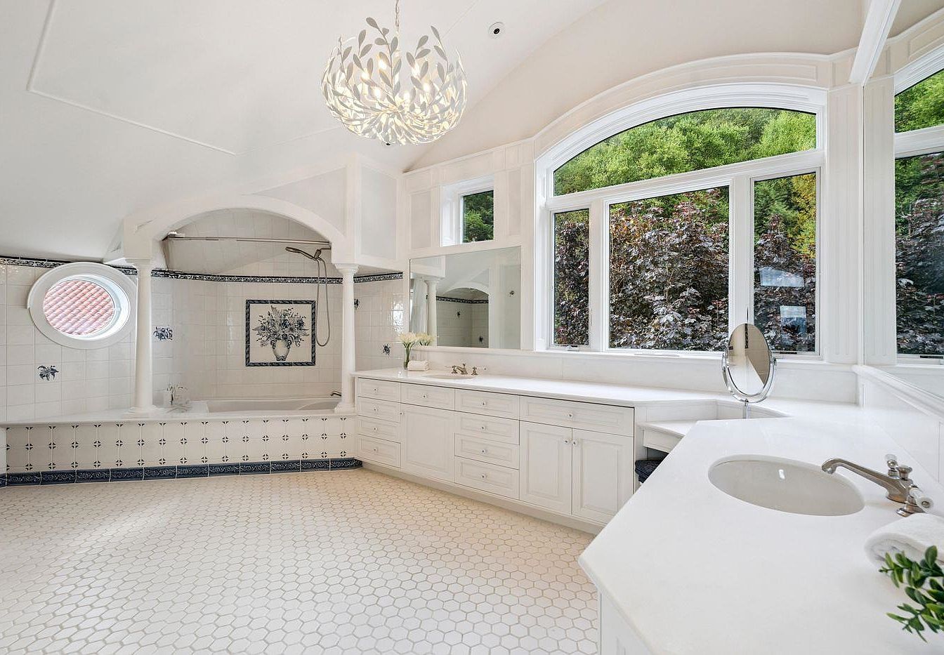 This spacious bathroom showcases a harmonious blend of white and soft blue hues, creating a serene atmosphere. A stunning chandelier hangs from the vaulted ceiling, illuminating the room’s elegant features. The classic hexagonal tile floor adds texture, complemented by intricate blue-and-white tile accents around the shower and bathtub. Oversized windows provide an abundance of natural light, framing lovely views of lush greenery. A dual sink vanity offers ample storage, while the decorative floral artwork enhances the charm. The relaxing bathtub and separate shower create an inviting, family-friendly retreat, perfect for unwinding after a long day.
