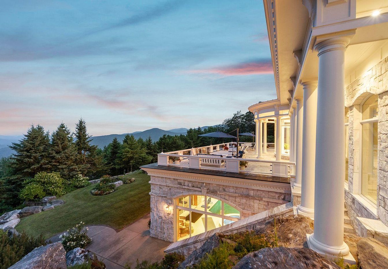 This stunning outdoor patio showcases elegant architectural details, featuring grand columns and an expansive deck that seamlessly blends indoor and outdoor living. The space is adorned with comfortable seating arrangements and stylish umbrellas, perfect for family gatherings or peaceful evenings under the stars. A tasteful color palette of soft whites and natural stone harmonizes with the lush greenery surrounding the home, enhancing the tranquil mountain views. The floor-to-ceiling windows invite natural light, ensuring a bright and inviting atmosphere. This outdoor retreat effortlessly combines beauty, relaxation, and functionality, making it an ideal space for entertaining or unwinding.