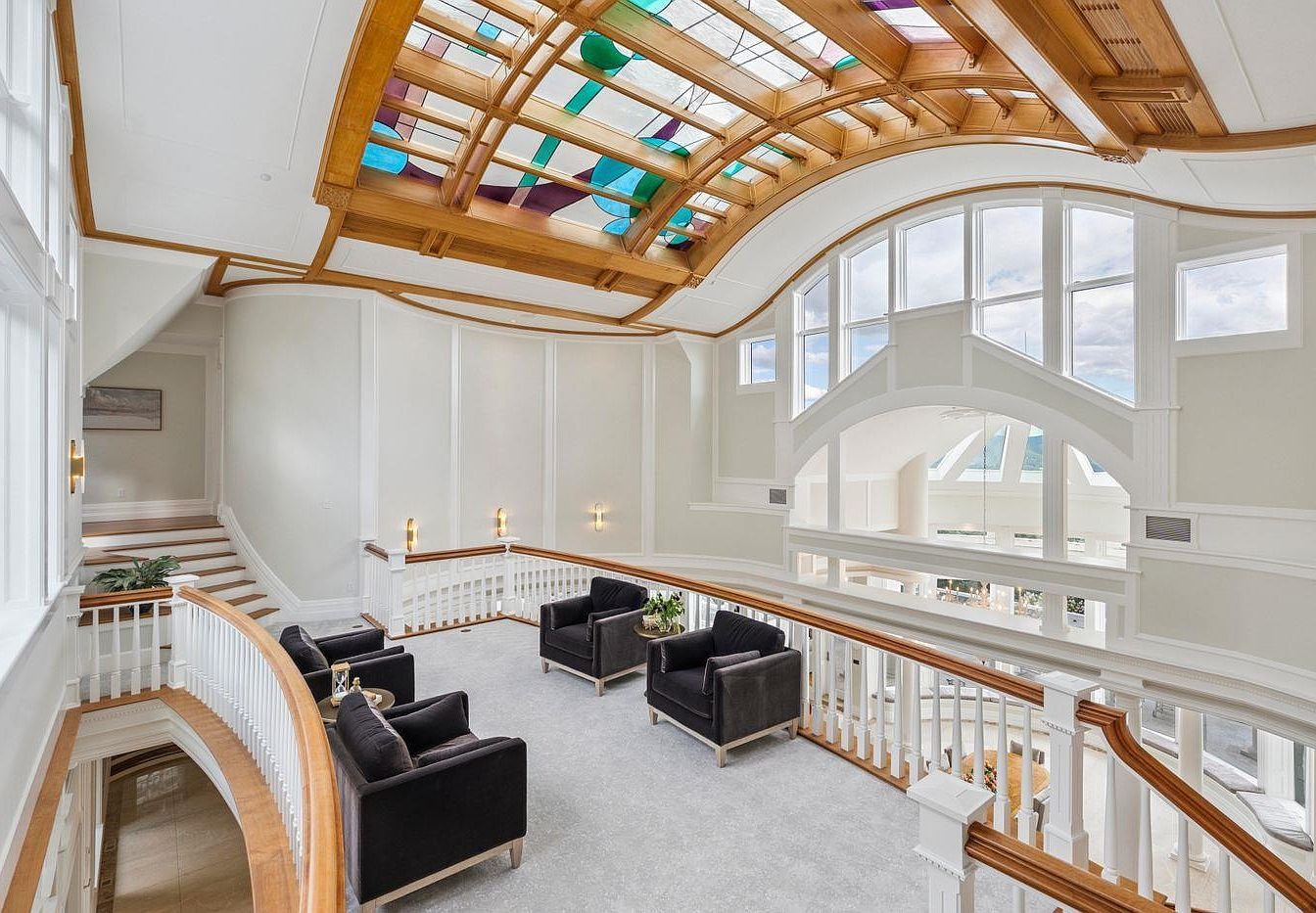 A stunning upper lounge area features an elegant design with soaring ceilings and a magnificent stained-glass skylight that bathes the room in colorful light. The soft, neutral color palette, complemented by dark wood accents, creates a serene atmosphere. Plush, black armchairs are arranged invitingly for conversation, while modern embellishments, such as subtle wall sconces and polished finishes, enhance the chic aesthetic. The curved balcony railing offers a unique architectural touch, leading visitors to gaze downward into the spacious living area below. This inviting space is perfect for family gatherings and relaxation, blending comfort with sophistication.