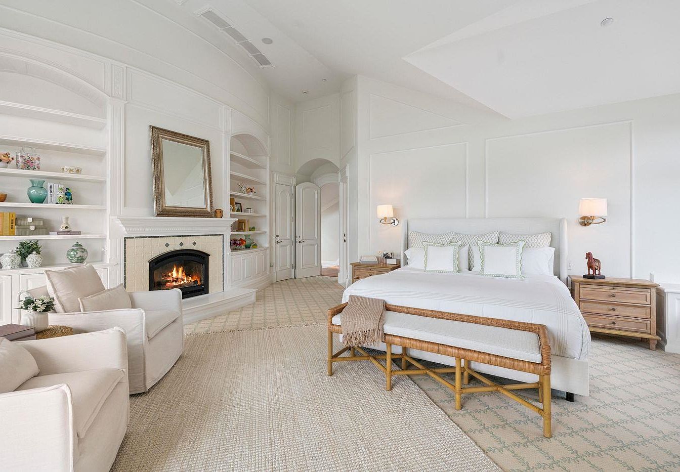 The master bedroom suite exudes tranquility with its spacious layout and elegant design. A plush king-sized bed, adorned with decorative pillows, invites relaxation, while the cozy seating area features comfortable armchairs perfect for reading. Soft neutral tones dominate the color scheme, complemented by rich textures like a woven rug underfoot. Architectural details such as built-in shelving and a stylish fireplace add sophistication and warmth. Functional elements include sleek nightstands, wall sconces that provide soft lighting, and ample storage behind the elegantly designed doors. This suite is beautifully curated for comfort and family-friendly living.