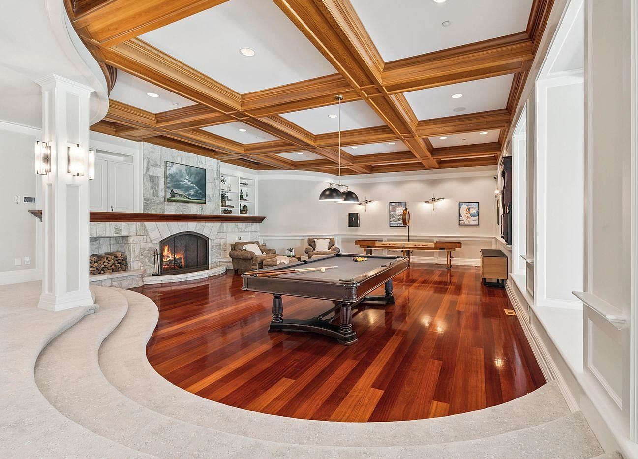 This dynamic game room features a stunning blend of elegance and functionality. The centerpiece, a sleek pool table, invites entertaining and leisure, surrounded by warm, rich hardwood flooring that radiates comfort. The intricate coffered ceiling highlights craftsmanship, complemented by stylish overhead lighting. A cozy seating area, with plush chairs, flanks a stone fireplace, creating an intimate gathering space. Neutral walls adorned with framed artwork enhance the inviting atmosphere. The open layout encourages flow, making it ideal for family activities. With decorative elements that evoke a sense of sophistication, this room is perfect for leisure and family bonding.