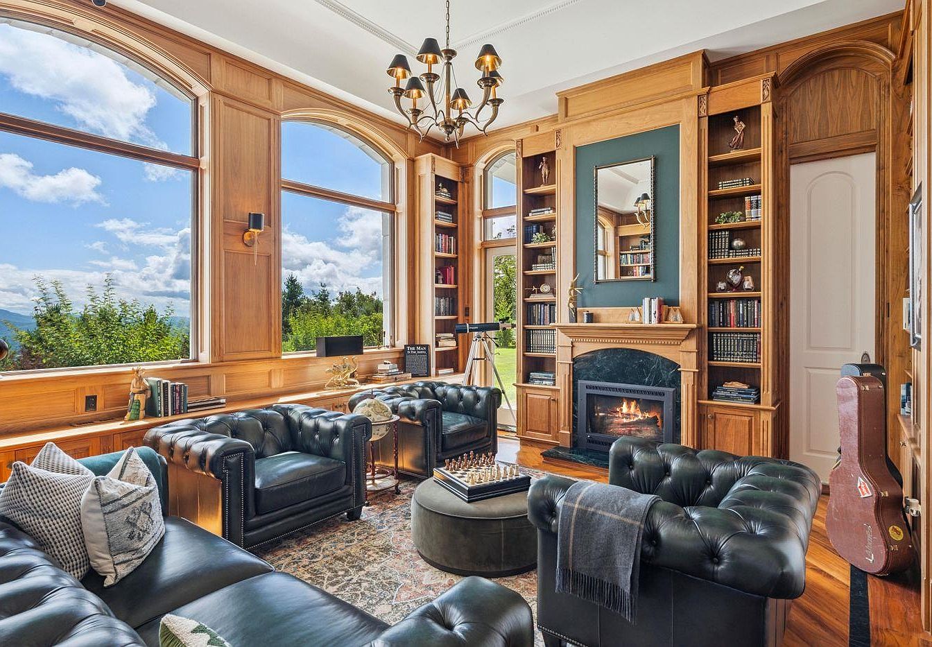 This elegant living room exudes sophistication and warmth, featuring large, arched windows that frame breathtaking views of the outdoors and allow ample natural light. The rich wooden paneling and built-in bookshelves create a cozy yet refined atmosphere. Comfortable black leather tufted sofas invite relaxation, accented by decorative pillows and a textured area rug that adds warmth underfoot. A sleek coffee table holds a classic chess set, perfect for family gatherings. The inviting fireplace serves as a focal point, enhancing the space’s charm. A stylish chandelier and modern decor elements add a contemporary touch to this timeless room.