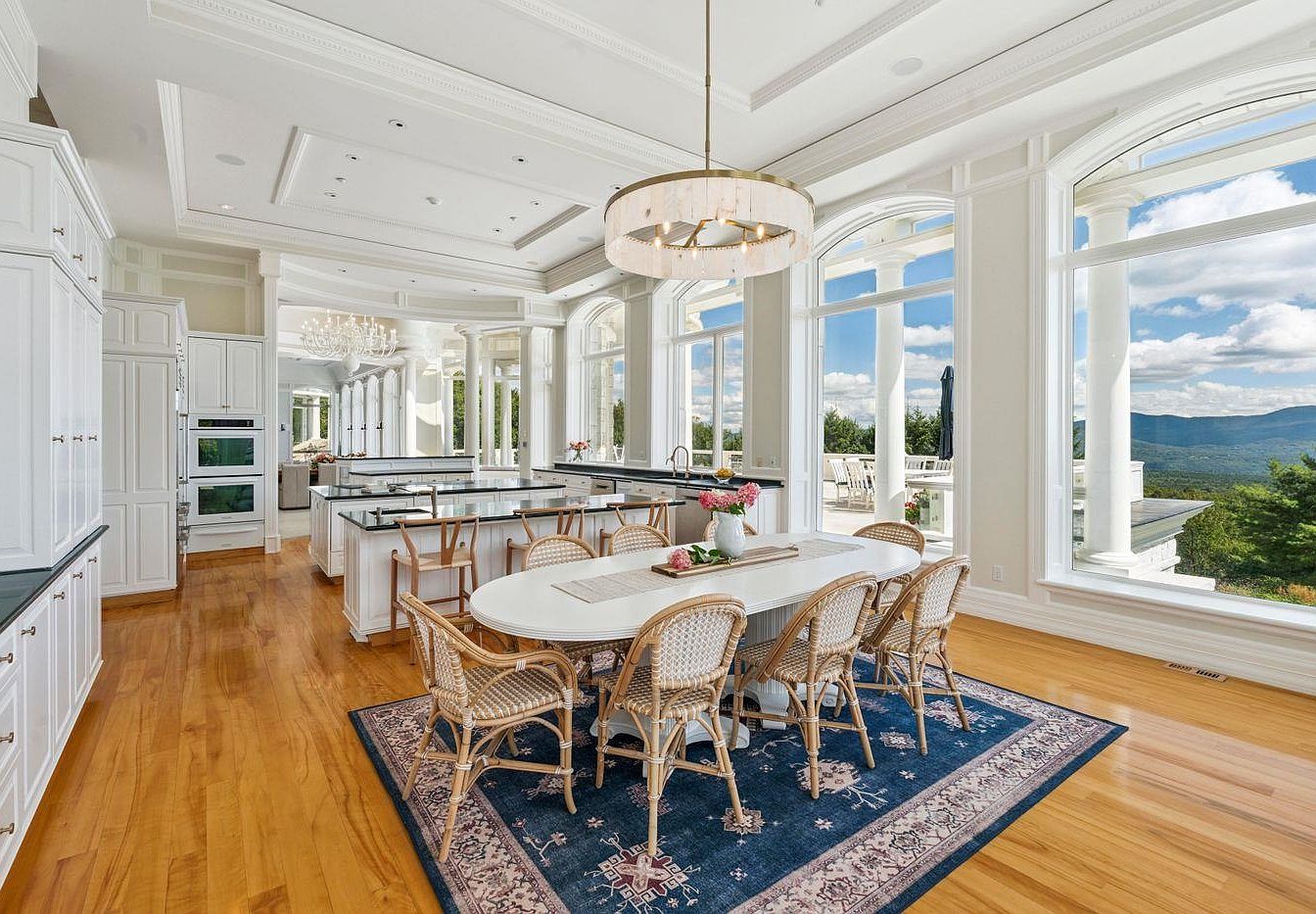 This spacious gourmet kitchen combines elegance with functionality, featuring white cabinetry and a striking black countertop that enhances the brightness of the large windows. Natural light floods the room, highlighting the refined architectural details such as crown molding and an exquisite chandelier. A sizable island and a classic dining table, surrounded by chic rattan chairs, create a perfect family gathering spot. The rich wooden flooring adds warmth, while the subtle area rug warms the space underfoot. With panoramic views of the surrounding landscape, this kitchen is perfect for both culinary adventures and comfortable family moments.
