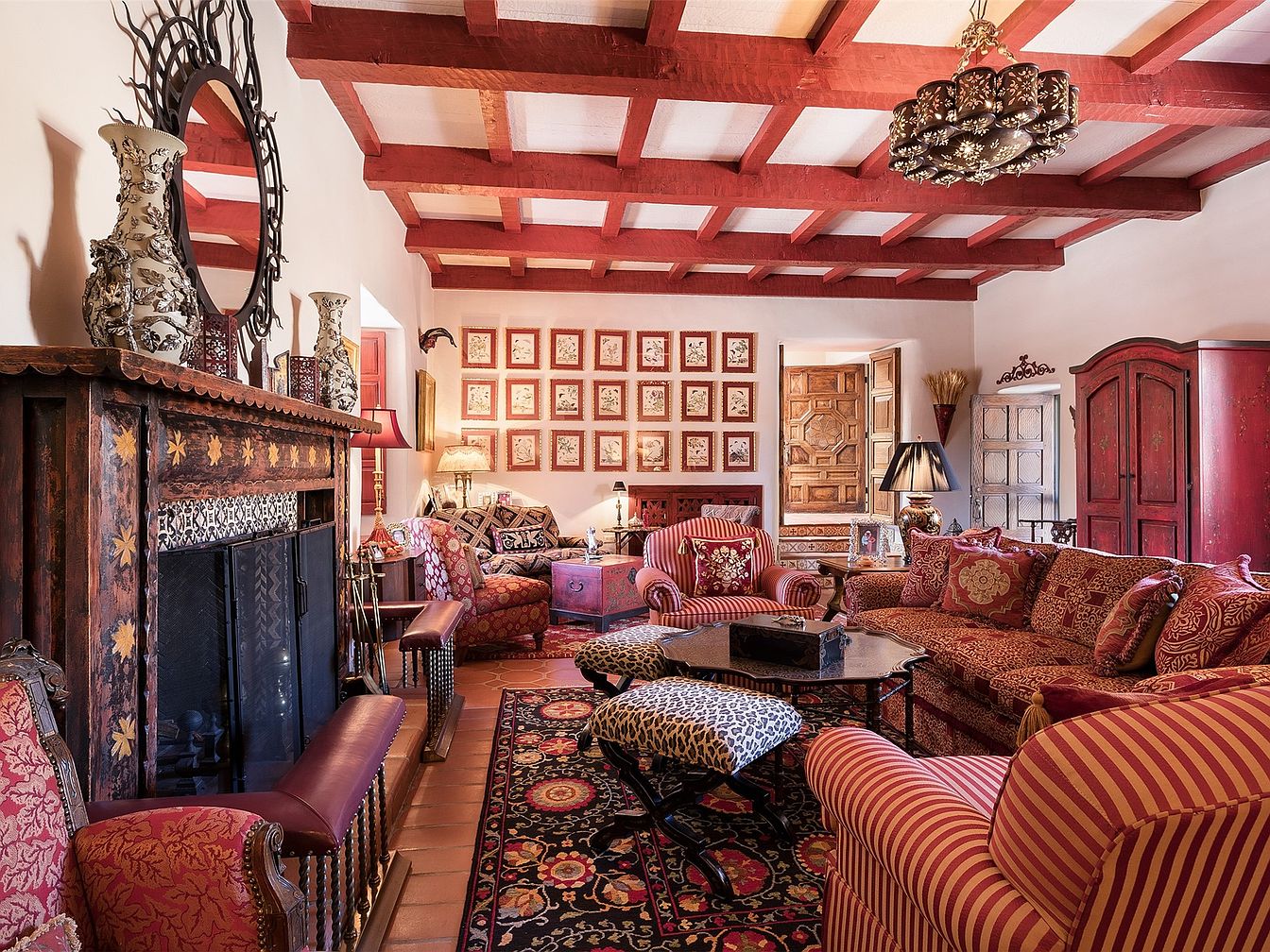 This inviting living room features a blend of rustic charm and vibrant colors, making it ideal for family gatherings. The room is anchored by a beautifully detailed wooden fireplace adorned with intricate carvings. Exposed red-beamed ceilings enhance the spacious feel, while plush sofas covered in rich fabrics, including floral and striped patterns, create a cozy atmosphere. A striking chandelier adds elegance, illuminating the carefully arranged artwork on the walls. The use of warm earth tones is contrasted by splashes of deep red and leafy greens, harmonizing with decorative accents like playful ottomans and ornate vases.