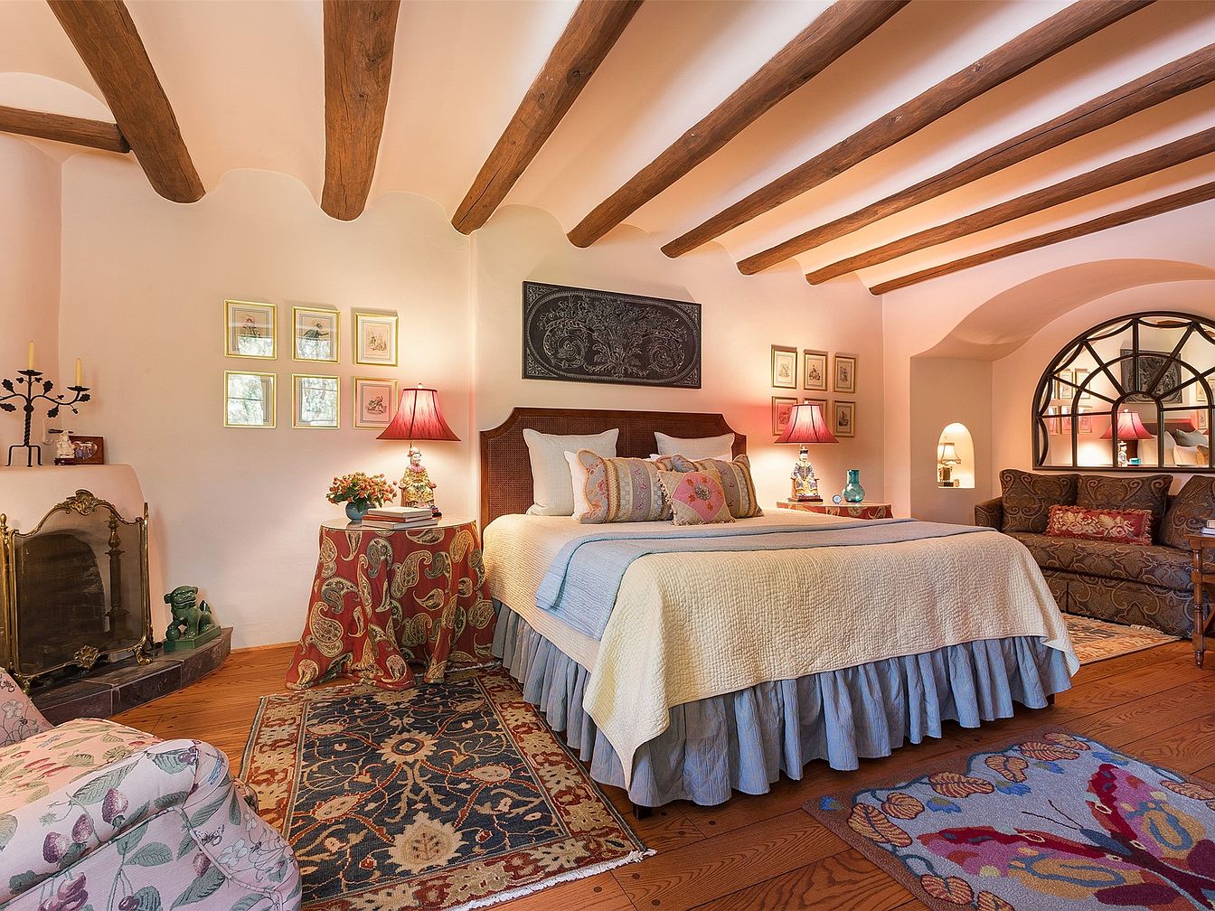 This inviting bedroom exudes warmth and charm, featuring a harmonious blend of rustic architectural elements and contemporary comfort. Exposed wooden beams grace the ceiling, enhancing the room’s spaciousness. A lavish bed, adorned with intricate pillows and a soft quilt, invites relaxation, while two elegant bedside lamps provide gentle illumination. Complementing the main furnishings, a plush couch and floral-patterned armchair offer cozy seating. Rich textiles in warm tones create a family-friendly atmosphere, ideal for unwinding. The window nook, accented with decorative mirrors, maximizes natural light and provides a picturesque view, embodying a serene respite for all.