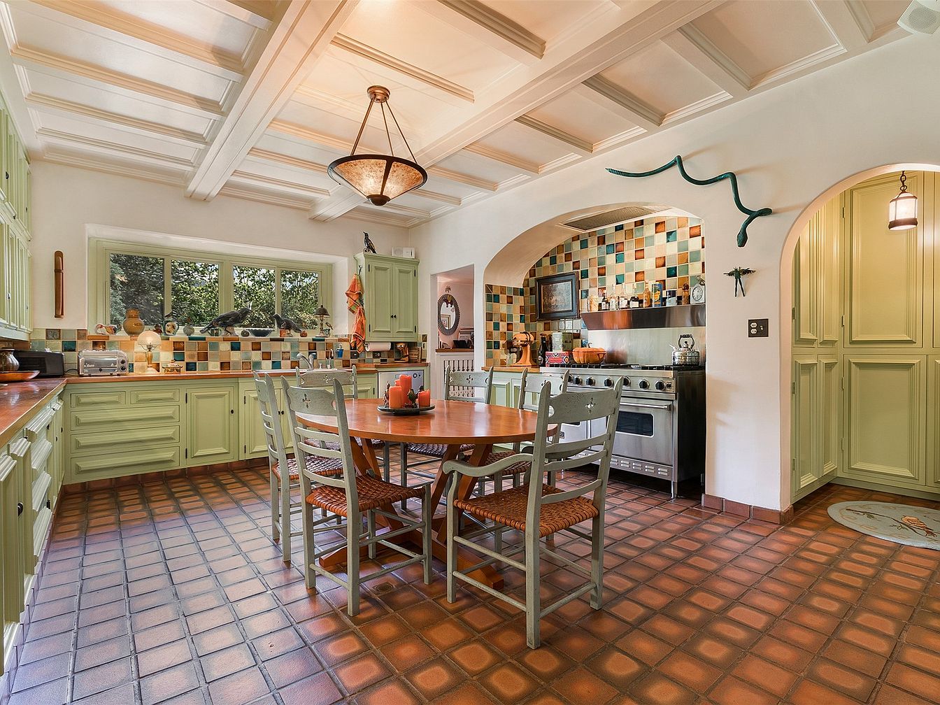 This delightful kitchen features a thoughtful layout that maximizes light and functionality. The soft green cabinetry harmonizes beautifully with the terracotta tile flooring, creating a warm and inviting atmosphere. A cozy wooden table at the center is perfect for family meals, while vibrant backsplash tiles add a playful splash of color. Natural light floods in through large windows, enhancing the cheerful ambiance, and the overhead lantern provides both illumination and charm. Classic archways lead to intimate nooks, while ample storage ensures everything remains organized. This kitchen serves as a welcoming hub for everyday gatherings and culinary adventures.