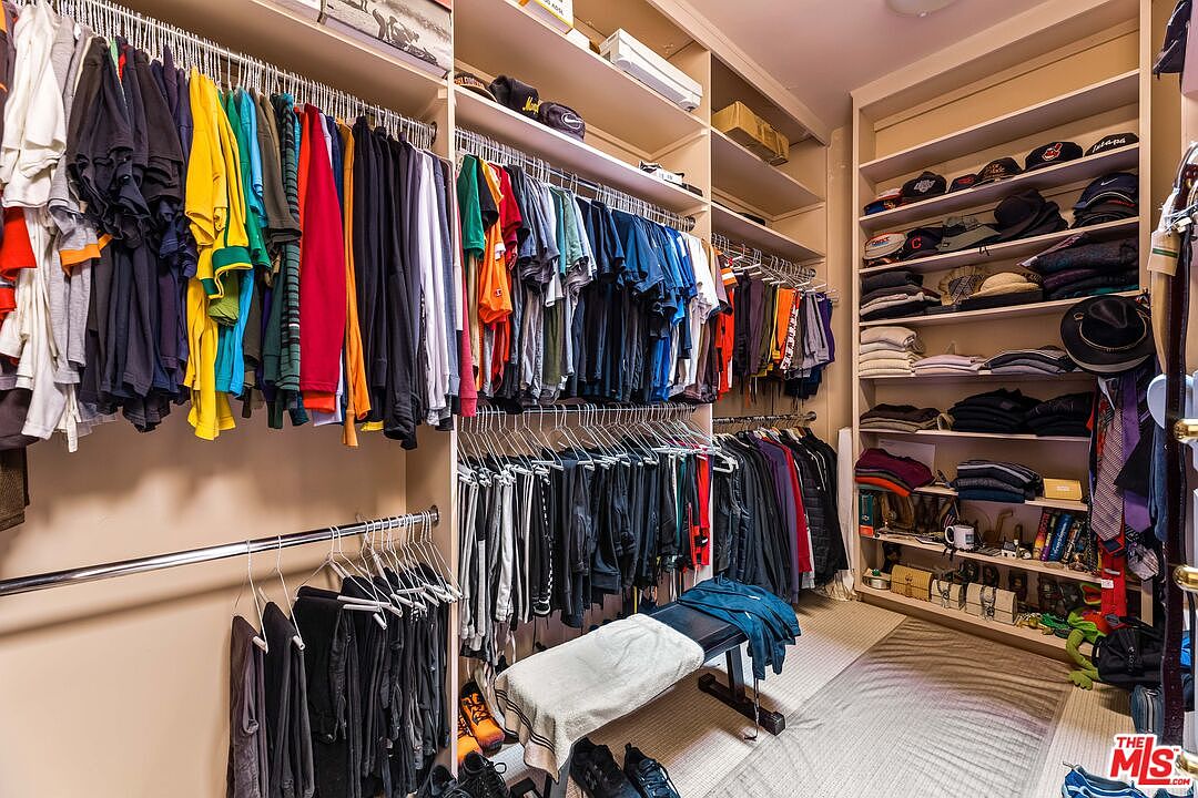 This spacious walk-in closet features a well-organized layout with ample shelving and hanging space for clothing and accessories. The walls are painted in a soft neutral tone, enhancing the bright atmosphere. An array of colorful shirts hangs neatly alongside an assortment of pants, providing easy access to clothing selections. A plush bench sits centrally, offering a comfortable spot for putting on shoes or sorting outfits. Additional shelves hold neatly folded garments and personal items, making it a practical yet stylish space. This family-friendly storage solution ensures everything has its place, promoting a clutter-free environment.