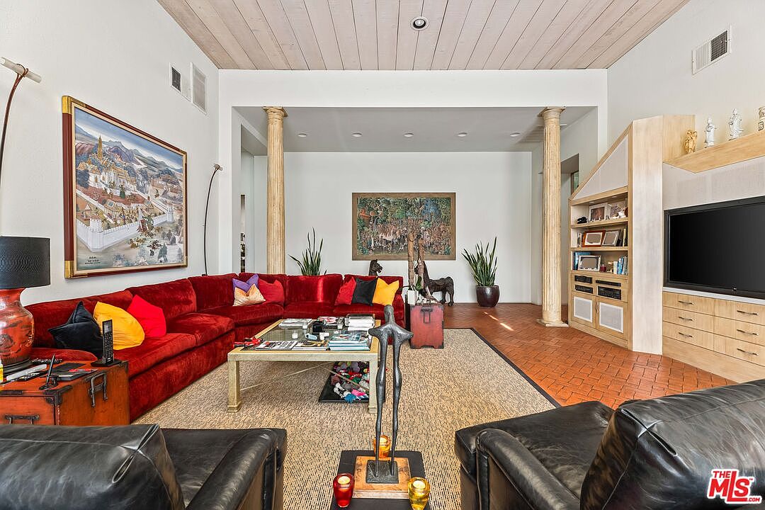This spacious living room features an inviting layout that blends comfort and style. A striking red velvet sofa pairs harmoniously with two black leather chairs, creating a cozy conversation area. The warm terracotta herringbone floors add a rustic touch, complemented by a chic oriental rug underfoot. Expansive windows flood the room with natural light, showcasing lush greenery from the terrace beyond, while a skylight above enhances the airy feel. Architectural pillars frame the space elegantly, and modern artwork adorns the walls, infusing personality. This family-friendly area is perfect for relaxation or entertaining, offering an open and welcoming atmosphere.