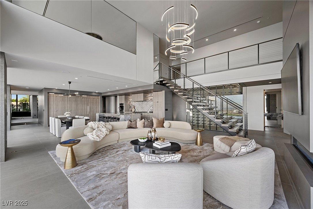 A modern open-concept living room seamlessly connects to the kitchen and features a soaring double-height ceiling. The central focus is a curved sectional sofa, perfect for family gatherings or movie nights, accented by a plush throw and assorted cushions for added comfort. A soft, neutral color palette of gray, beige, and cream is highlighted by metallic and black coffee tables that lend a touch of sophistication. The space is defined by a dramatic contemporary chandelier, sleek glass stair railings, and a statement linear fireplace. Large wall art, abundant natural light, and easy access to the kitchen create a warm, welcoming family hub.