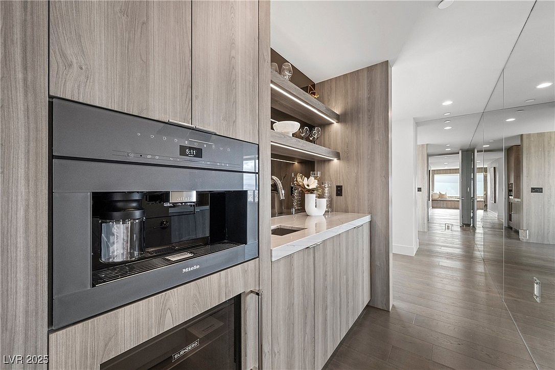 A sleek built-in coffee bar and pantry area crafted with light wood cabinets and matching paneling, this space offers a modern and sophisticated atmosphere perfect for family gatherings or daily routines. The integrated appliances, including a high-end coffee maker and under-counter fridge, blend seamlessly with the cabinetry, ensuring a streamlined look. Floating open shelves display decorative glassware and practical dishware, adding visual interest and easy access for busy mornings. Soft under-shelf lighting, a neutral color palette, and a minimalist marble countertop amplify the sense of brightness. The nearby hallway and mirrored wall add depth and make the area feel larger and welcoming.