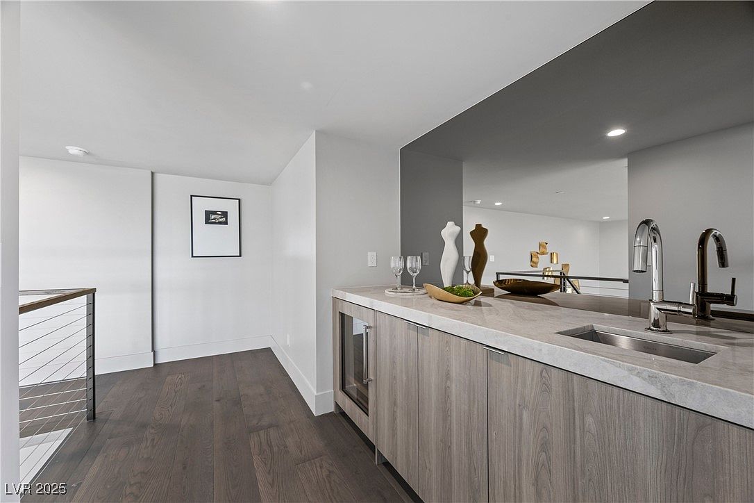 This modern upstairs wet bar features sleek wood cabinetry and a light stone countertop, creating a gentle contrast with rich dark wood flooring. The open layout connects effortlessly to adjacent living spaces, making it ideal for entertaining family and friends. Simple, sculptural decorative pieces add a contemporary artistic touch, while built-in amenities like a wine fridge and deep sink enhance both style and functionality. Soft gray walls and minimalist trim keep the aesthetic clean and inviting, providing a relaxing atmosphere for gatherings or family time. A cable railing stairway adds a modern, safe, and sophisticated element to the space.
