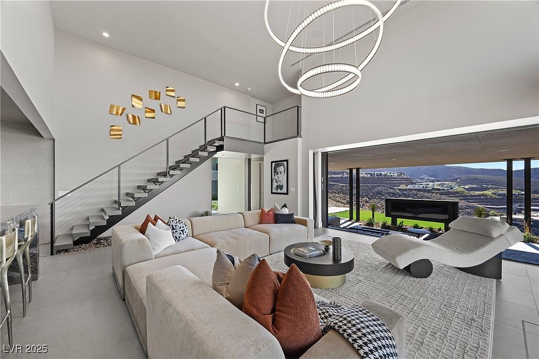 A stunning open-concept living room featuring soaring ceilings and expansive sliding glass doors that connect seamlessly to the outdoor patio, offering breathtaking mountain views. The neutral palette, anchored by a plush sectional sofa adorned with colorful accent pillows, creates a cozy and inviting space ideal for family gatherings. Unique statement lighting and gold wall art provide a touch of contemporary elegance, while the sleek floating staircase and modern furniture enhance the futuristic vibe. Natural light floods the space, making it suitable for children and adults alike, and the open layout encourages both relaxation and entertainment.