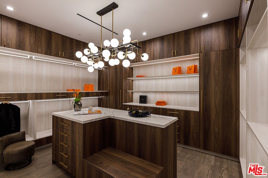This elegant walk-in closet features rich wooden cabinetry that combines functionality with a sophisticated aesthetic. The sleek marble countertop provides an ideal surface for display or accessories, while warm-toned wood cabinets harmoniously blend with the lighter wall paneling. A stunning chandelier illuminates the space, highlighting the organized shelving and subtle details, including gold hardware accents. The layout encourages an easy flow, perfect for family use, while strategically placed shelves offer ample storage for bags and shoes, showcasing a modern touch. Overall, this design balances luxury and practicality, making it a perfect haven for fashion enthusiasts.