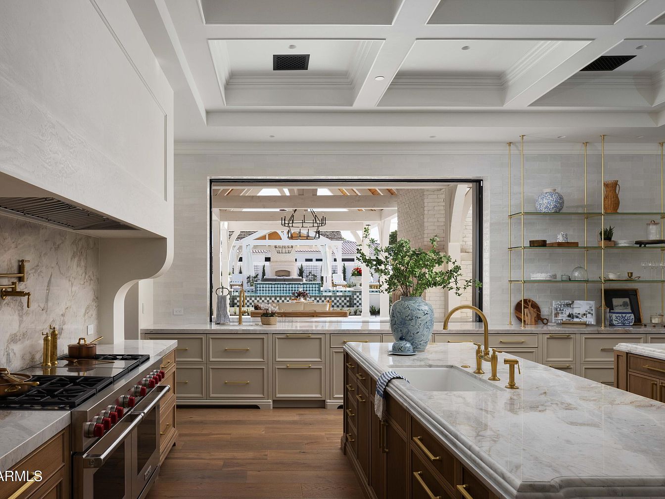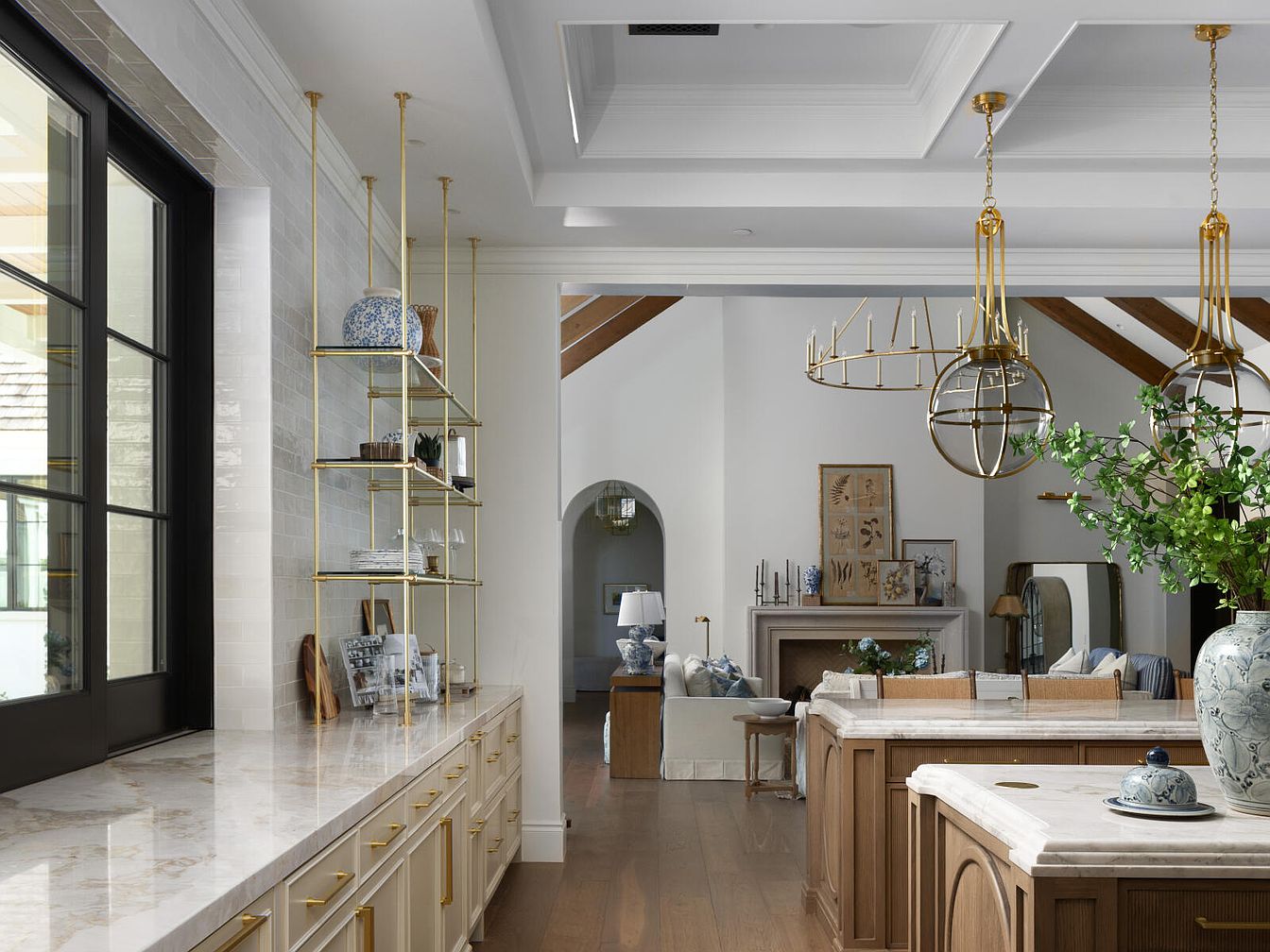 This spacious open concept kitchen merges functionality and style, offering a perfect family-friendly environment. The elegant marble countertops and light wood cabinetry create a warm and inviting atmosphere, while the gold accents in the light fixtures and shelving add a touch of sophistication. Large windows flood the space with natural light, illuminating the intricate details of the coffered ceiling and showcasing decorative plants and ceramics on floating shelves. An expansive island serves as a central gathering point, perfect for casual family meals. The seamless transition to the adjacent living area enhances the home’s cohesive design, promoting connection and togetherness.