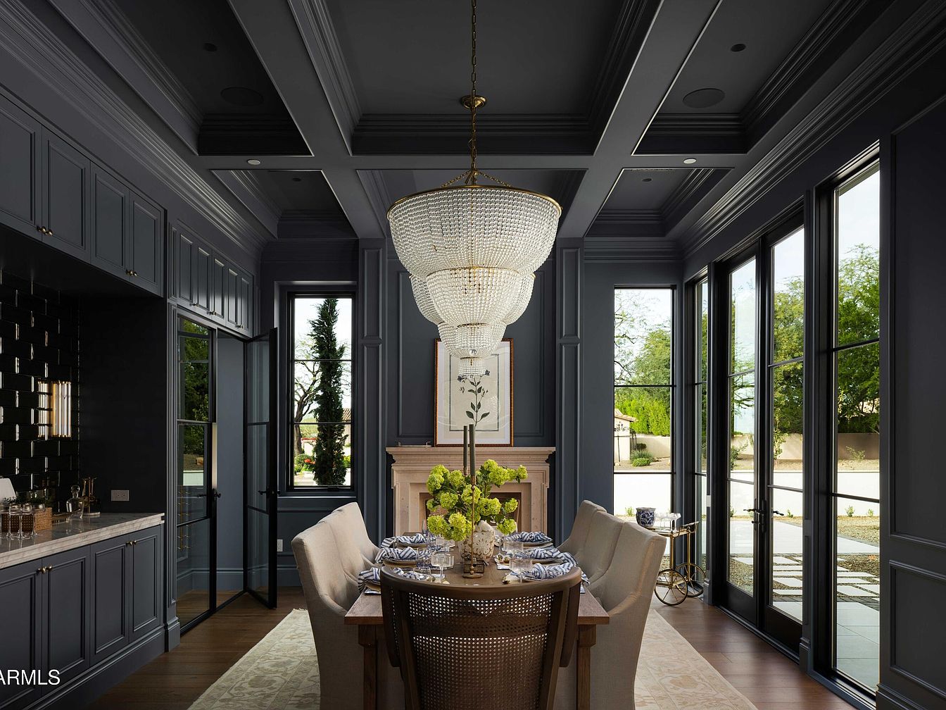 The dining room showcases a refined blend of modern elegance and warmth. Dark blue paneled walls frame large windows that invite natural light, enhancing the room’s spacious feel. The sophisticated coffered ceiling adds depth, while a stunning crystal chandelier serves as a focal point above a beautifully set dining table. Comfortable, upholstered chairs create an inviting atmosphere, ideal for family gatherings or entertaining guests. A marble-topped sideboard complements the decor, offering functionality without compromising style. The overall color scheme, featuring rich blues and subtle neutrals, fosters a cozy yet upscale ambiance, making it a perfect space for memorable meals.