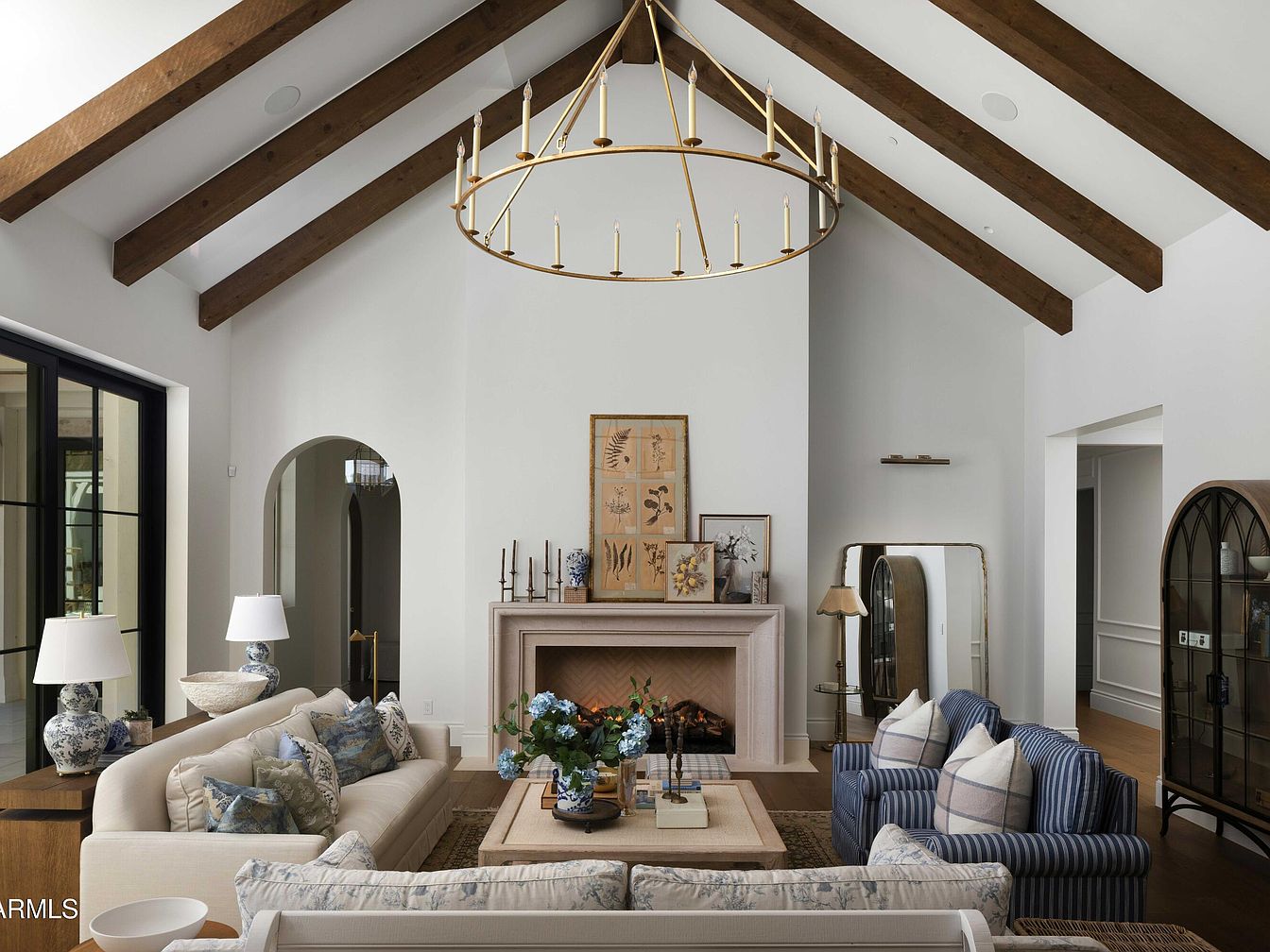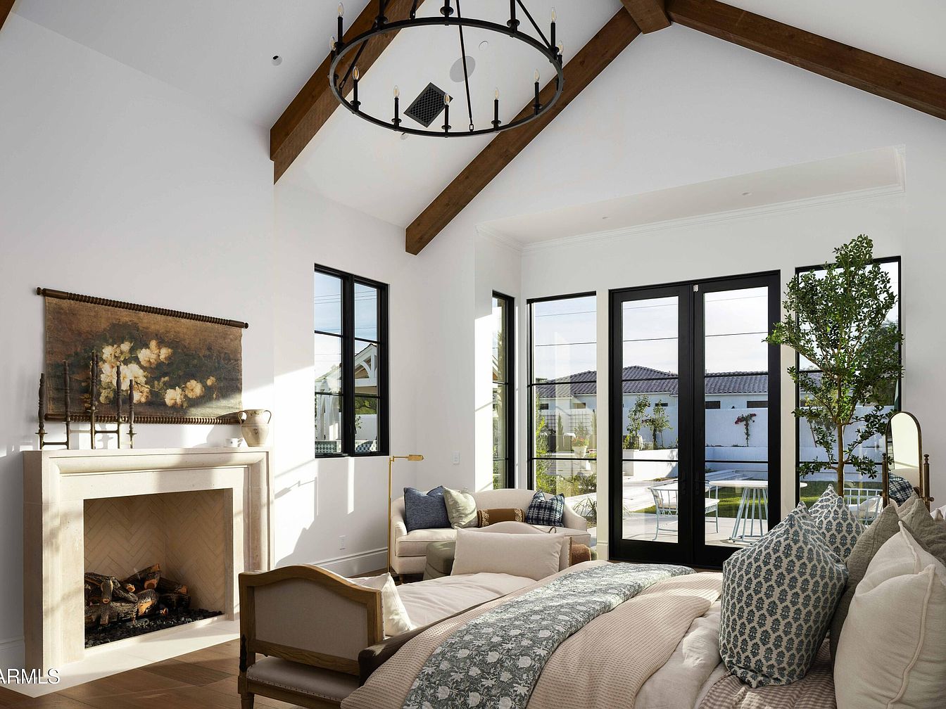 This inviting living room features a striking blend of contemporary and classic design, highlighted by a dramatic vaulted ceiling adorned with rustic wooden beams. A striking gas fireplace, framed with elegant stone, serves as a focal point, flanked by tasteful artwork and decor that exudes warmth. Large black-framed windows and doors flood the space with natural light, creating an airy atmosphere that connects indoors with the outdoor patio. Plush seating with stylish throw pillows complements a relaxed yet sophisticated aesthetic, while potted greenery adds a refreshing touch. Perfect for family gatherings or quiet mornings, this space balances comfort and elegance.