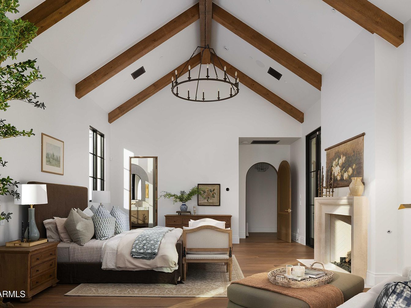 This spacious master bedroom features a stunning vaulted ceiling, accentuated by wooden beams that add warmth and character. A cozy king-sized bed, adorned with plush pillows and a soft quilt, promises restful nights. Light streams through large windows, enhancing the neutral color palette of whites, creams, and warm woods, creating a serene atmosphere. The elegant nightstands house contemporary lamps, while a stylish armchair and tasteful artwork invite relaxation. A fireplace with a refined mantel adds a touch of luxury, seamlessly blending comfort with sophistication. Perfect for family living, the space balances aesthetic charm with practical functionality.