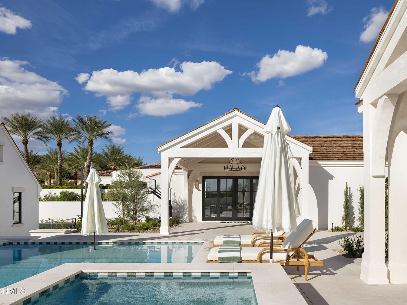 This stunning outdoor patio space is a perfect blend of relaxation and sophistication, featuring a sleek pool that invites family gatherings and sunny afternoons. The architectural design highlights large, open spaces with tall, white beams that contribute to a sense of airy elegance. Sun loungers are elegantly placed nearby, offering comfort under the protective shade of crisp white umbrellas. The surrounding lush greenery and palm trees add a tropical flair, enhancing the tranquil atmosphere. The color palette, featuring soft whites and natural wood tones, harmonizes beautifully with the serene blue water, making this area an idyllic retreat.