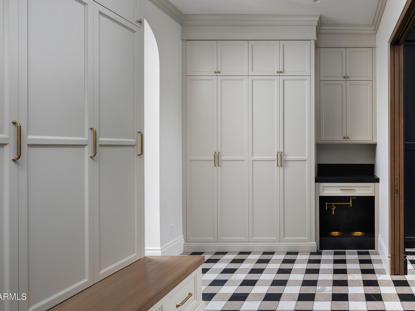 This stylish mudroom showcases a seamless blend of functionality and elegance, perfect for family life. The rich black-and-white checkered floor offers a striking contrast to the soft, light-grey cabinetry. Generous storage options are provided by tall cabinets, equipped with sleek gold handles, while a built-in bench enhances convenience. The architectural details, including crown molding and arched doorways, add sophistication to the space. Natural light filters through the nearby doorway, creating a warm and inviting atmosphere. Thoughtfully designed for organization and ease, this mudroom serves as a beautiful transition between the outdoors and living areas.