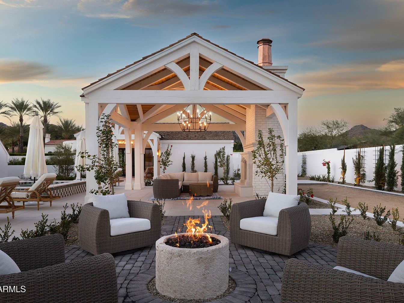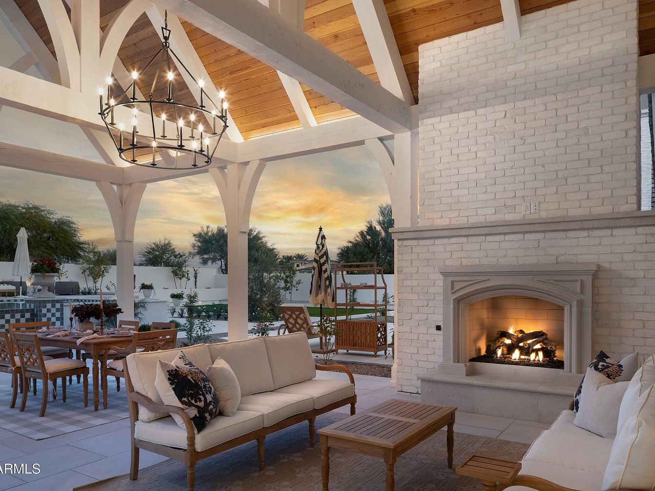 An inviting outdoor living space blends elegance with comfort, featuring a spacious covered area adorned with exposed beams and a stunning chandelier that harmonizes with the wooden ceiling. Plush seating invites relaxation near the chic, white-brick fireplace, creating a cozy atmosphere for gatherings. The neutral color palette, accented with decorative pillows, complements the surrounding lush greenery. A substantial dining table encourages family meals under the stars, while nearby lounge areas foster casual conversations. The design seamlessly integrates indoor and outdoor living, making it ideal for enjoying evenings by the fire or entertaining guests amid serene surroundings.