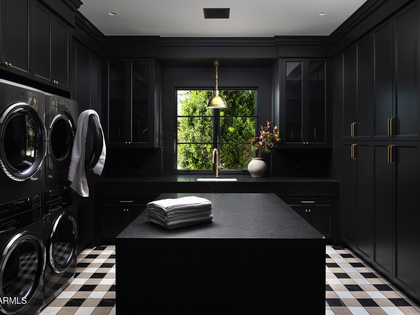 This elegantly designed laundry room features a striking black color scheme, combining sleek cabinetry with sophisticated gold hardware for a contemporary flair. The layout includes a modern washer and dryer unit, seamlessly integrated into the cabinetry, maximizing functionality. A central island serves as both a workspace and a folding area, topped with a rich black surface that complements the bold aesthetics. Checkerboard tile flooring adds visual interest, balancing modernity with a classic touch. Large windows invite natural light while offering a view of greenery outside, enhancing the inviting atmosphere, making laundry chores feel less daunting.