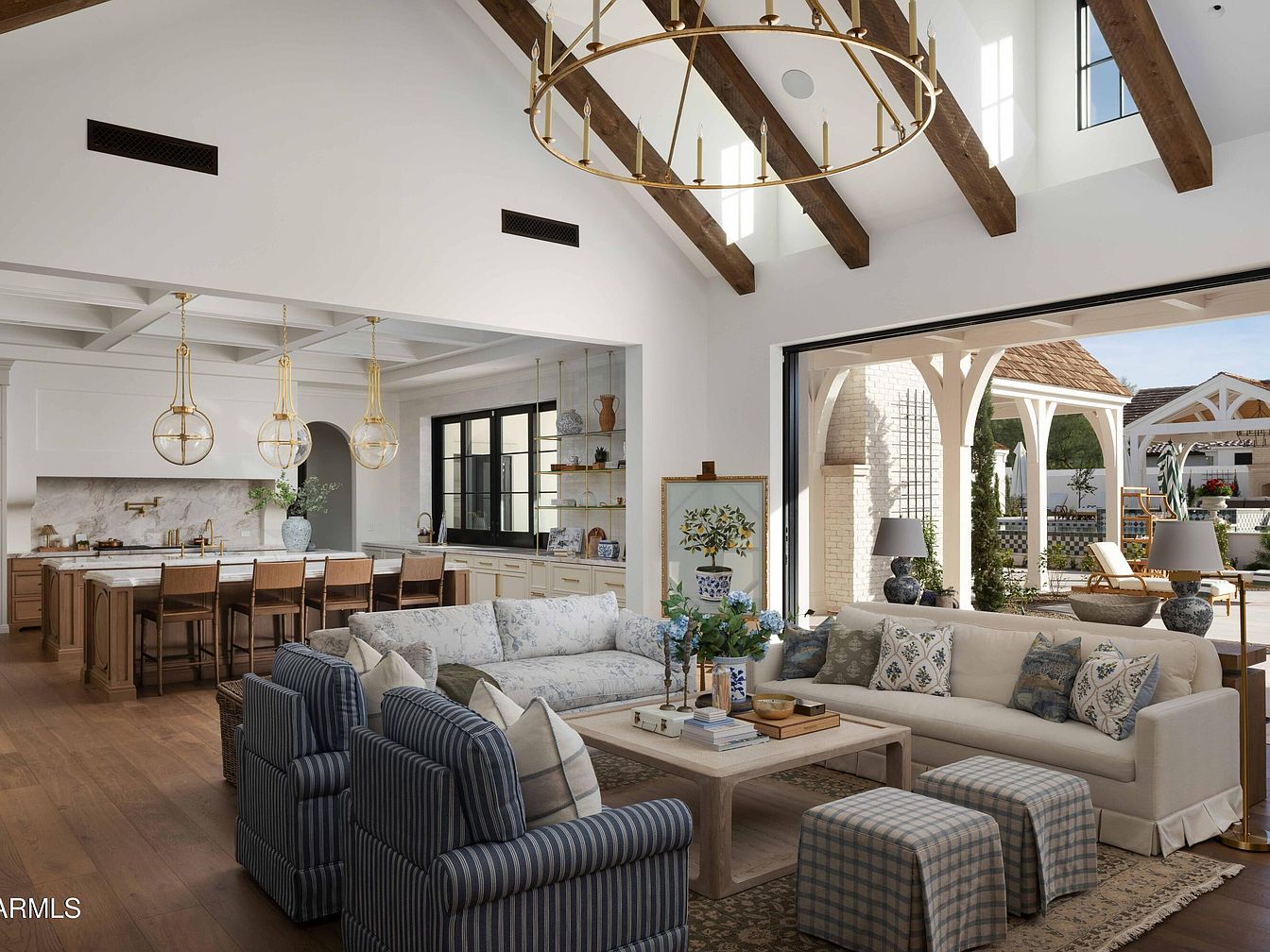 This bright, open living space combines elegance and comfort, featuring a vaulted ceiling with exposed wooden beams that add warmth. A large, inviting sectional sofa is adorned with patterned cushions, encouraging family gatherings, while a stylish coffee table anchors the seating area. The adjoining kitchen boasts a magnificent marble countertop, complemented by sleek, modern cabinetry and tasteful pendant lighting that illuminates the space. Large windows invite natural light, seamlessly connecting indoor and outdoor areas through sliding glass doors. The decor reflects a calming color palette of whites, blues, and subtle earth tones, creating a serene and inviting atmosphere.