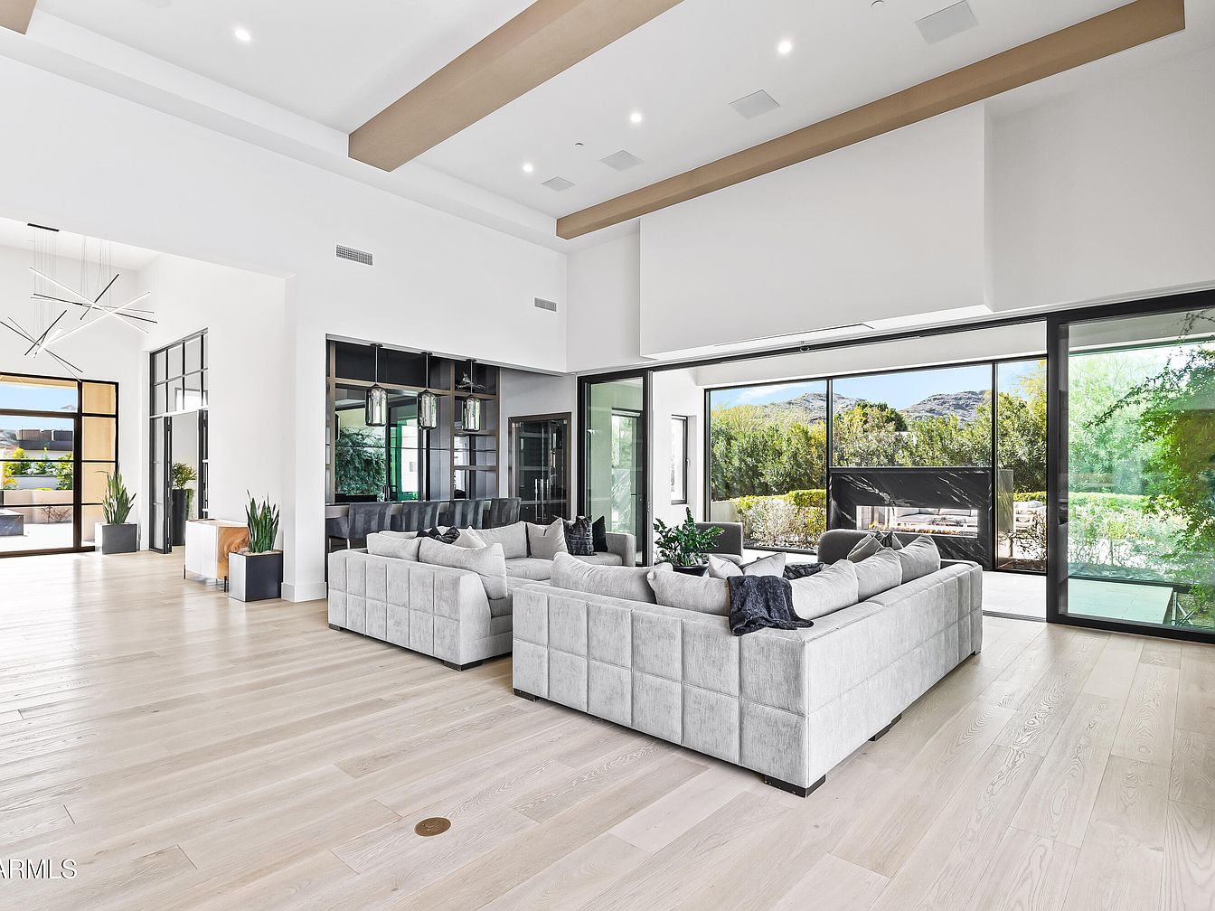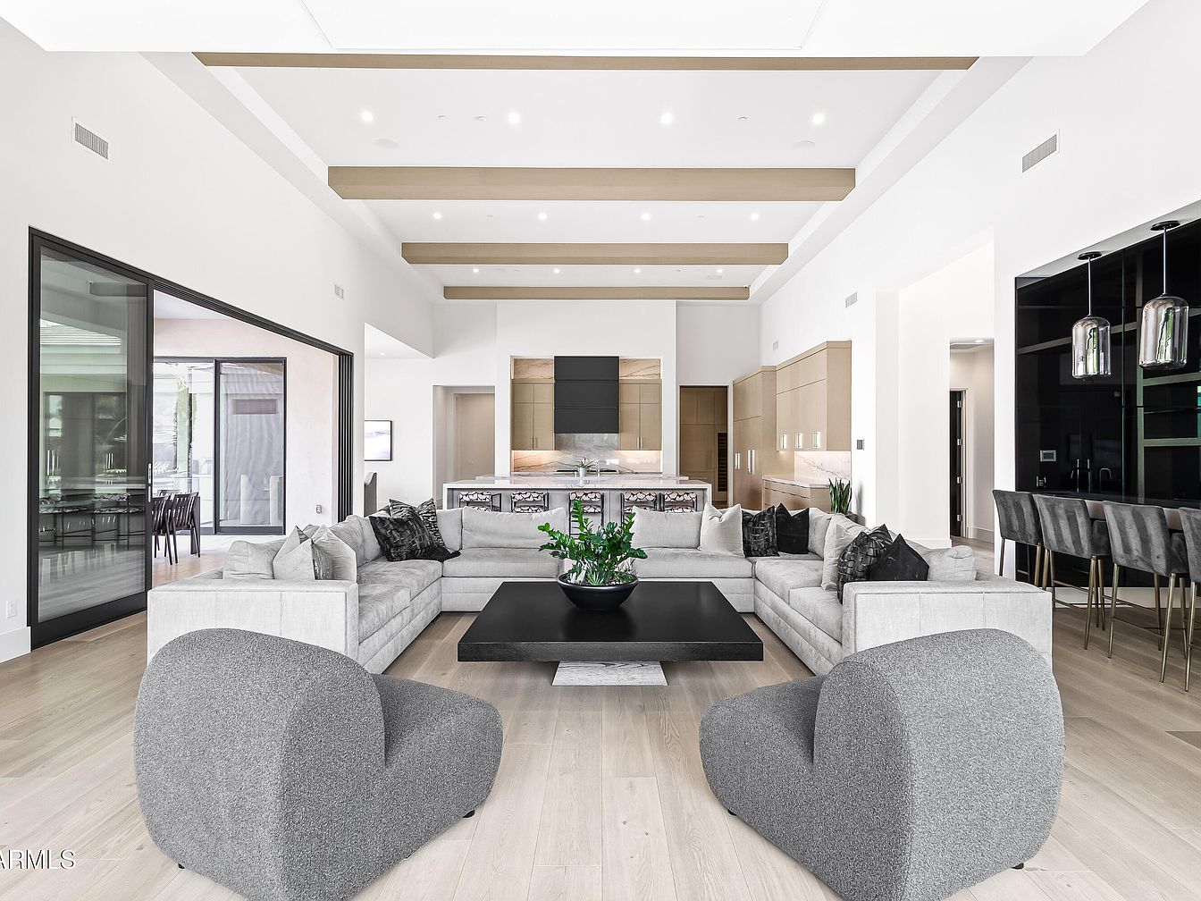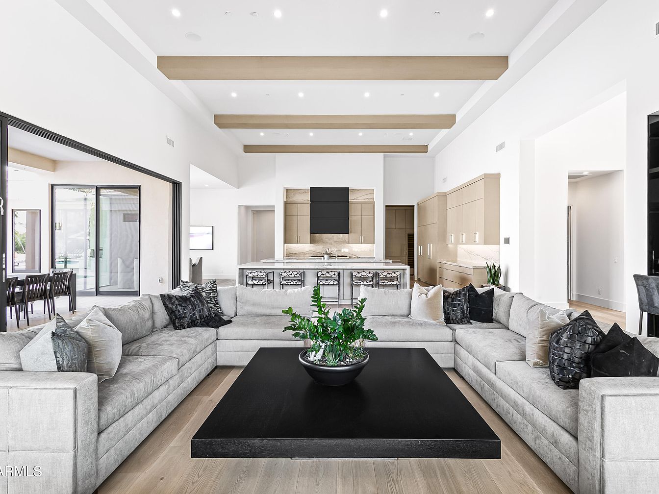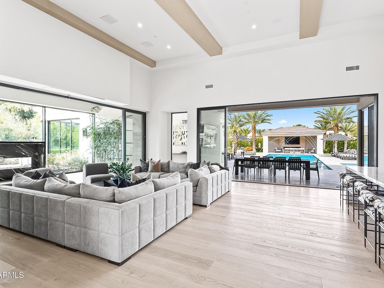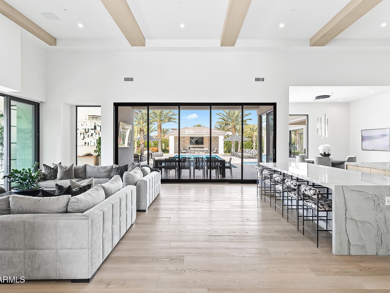 This expansive open living area blends sophistication with comfort, featuring a spacious layout that seamlessly integrates the indoor and outdoor environments. The plush sectional sofa, adorned with decorative throw pillows, beckons relaxation while accentuating the soft, neutral color palette. Natural light floods the room through floor-to-ceiling glass doors, showcasing a view of lush landscaping and a sparkling pool. The elegant ceiling beams enhance the sense of space, complementing the sleek marble countertops of the adjoining kitchen. This family-friendly design focuses on sociable living, making it an inviting hub for gatherings and entertainment.