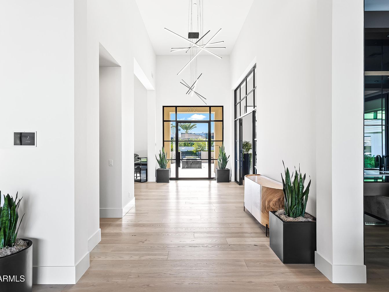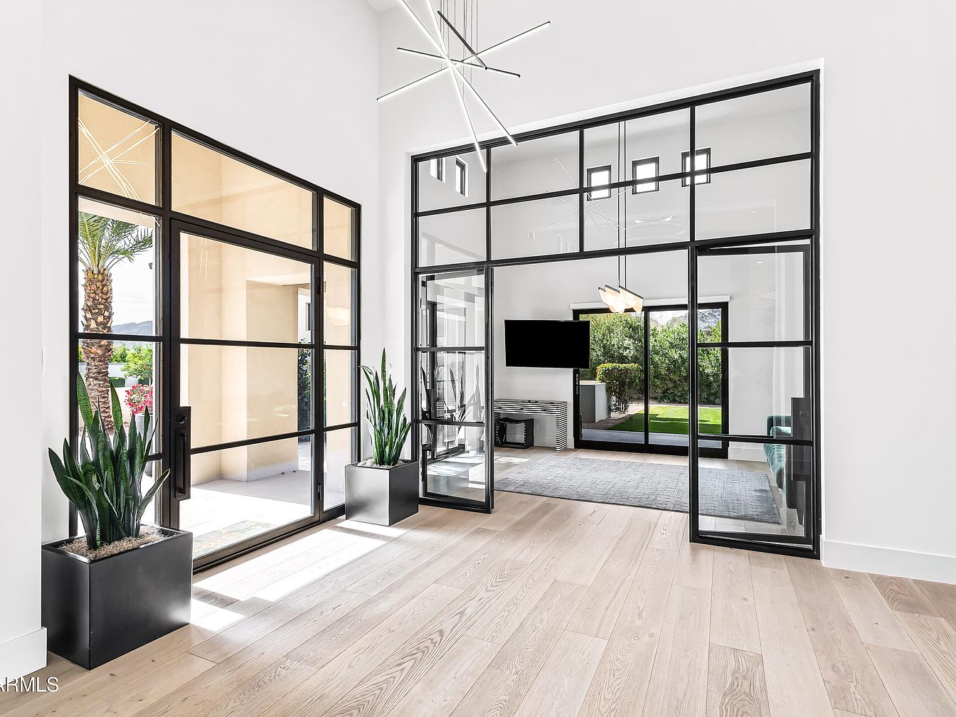 This inviting entrance foyer features a modern open layout accentuated by large, black-framed glass doors that connect indoor and outdoor spaces. The floor-to-ceiling windows usher in ample natural light, highlighting the beautiful light wood flooring that creates a warm ambiance. Flanking the entrance, tall, sleek planters house lush greenery, enhancing the space’s fresh and welcoming vibe. The minimalist chandelier above adds a contemporary touch, seamlessly blending with the airy white walls. Adjacent to this area, a cozy seating arrangement invites family gatherings, while the view of the lush backyard offers a serene connection to nature, perfect for relaxation.