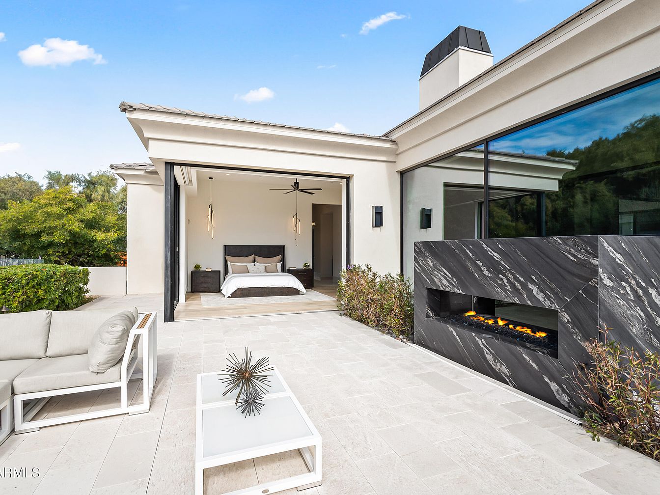 This serene master bedroom patio seamlessly merges indoor and outdoor living. The elegant layout features oversized sliding glass doors that open to a tranquil space, adorned with sleek furniture and calming neutrals. A modern ceiling fan enhances comfort, while the plush bed, flanked by stylish nightstands, invites relaxation. The adjacent outdoor lounge, complete with minimalist seating and a chic coffee table, promotes family gatherings in a peaceful setting. A striking marble feature wall with a built-in fire element adds sophistication and warmth, complemented by lush greenery that creates a refreshing ambiance, perfect for unwinding after a long day.