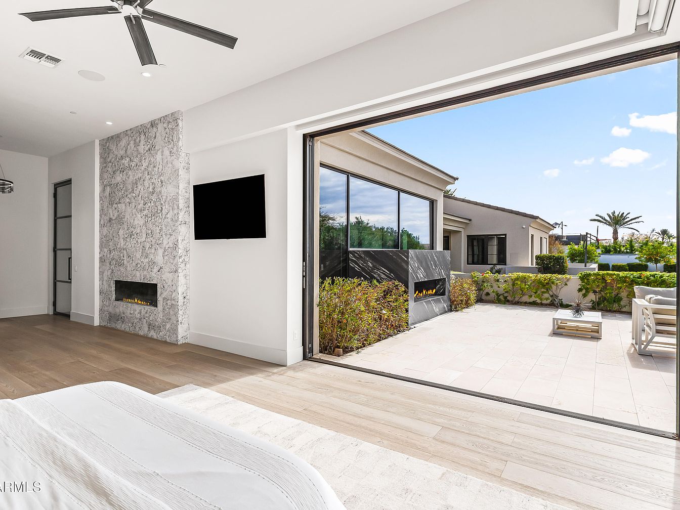 This master bedroom exudes serenity and modern elegance with its spacious layout. A stunning textured stone feature wall adds character, while the sleek, minimalistic fireplace enhances the cozy ambiance. The color palette is a soothing combination of light hues, highlighted by natural light streaming through expansive sliding doors. These doors seamlessly connect the indoor space to an inviting outdoor patio, perfect for relaxation. Family-friendly features include wide, easy-to-navigate spaces and thoughtful design, ensuring comfort. Contemporary ceiling fans and stylish furnishings complete the aesthetic, making this bedroom a perfect retreat for family and guests alike.