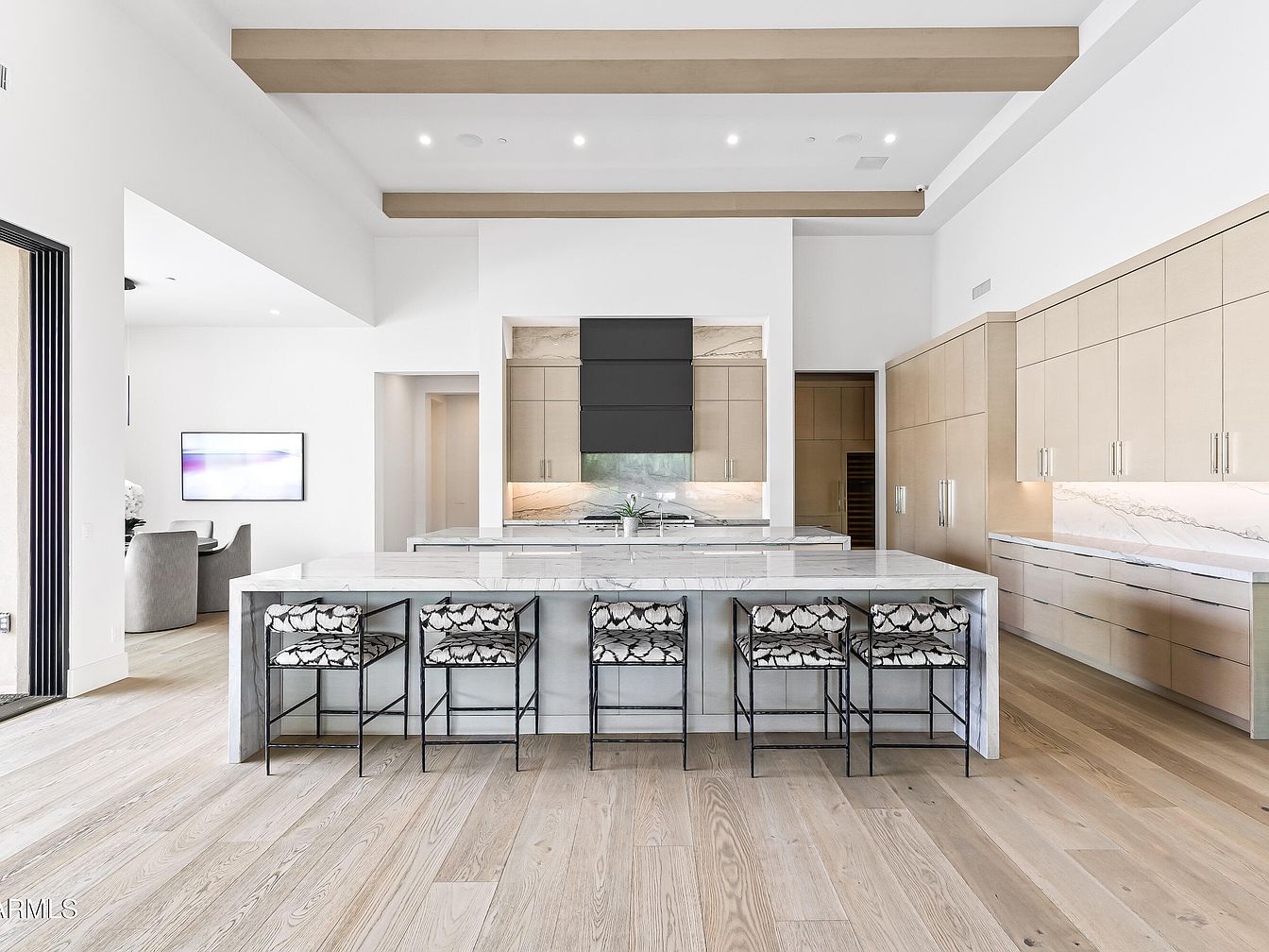 This contemporary kitchen showcases a harmonious blend of functionality and elegance. The spacious layout features a stunning marble island with sleek, geometric lines, providing ample space for family gatherings. Dark cabinetry contrasts beautifully with the light wood floors, creating a warm yet modern atmosphere. Stylish bar stools with patterned upholstery invite casual dining, while integrated appliances maintain a clean aesthetic. Natural light floods the space through expansive windows, enhancing the open feel. Contemporary details like the exposed beams and minimalist cabinetry add to the sophisticated charm, making it the perfect heart of the home for culinary creativity.