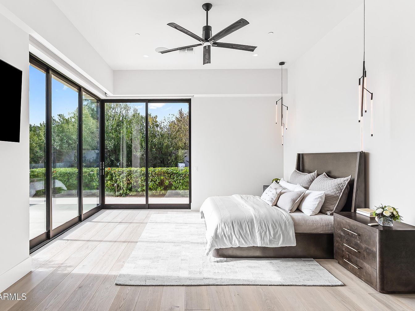 A master bedroom retreat exuding modern elegance with a sleek, minimalist design. Natural light floods the spacious layout through expansive sliding glass doors that open to a verdant outdoor space, blending indoor and outdoor living seamlessly. The calming color scheme features soft neutrals, creating a tranquil atmosphere. A contemporary bed with a plush headboard is complemented by luxurious fabrics and an array of stylish pillows. Unique pendant lights hang artistically from the ceiling, adding a touch of sophistication, while the warm wooden flooring enhances the inviting ambiance. Thoughtfully designed for comfort, this space is perfect for relaxation.