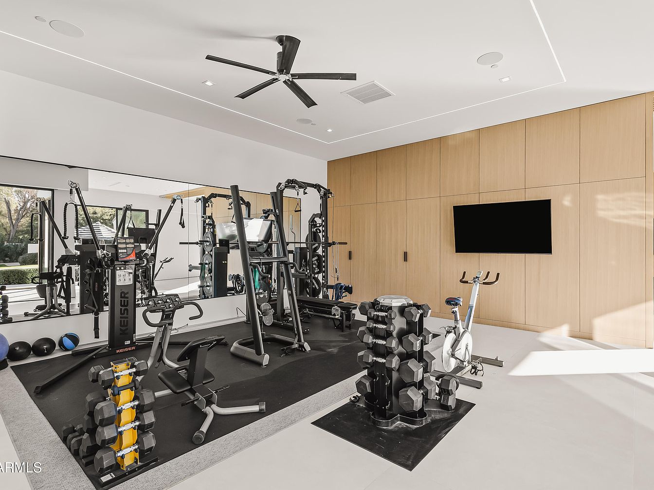 This modern home gym blends functionality and aesthetics, designed for both serious workouts and relaxation. Polished concrete flooring is complemented by elegant wooden cabinetry, offering a warm contrast. The spacious layout accommodates high-quality fitness equipment, including weights and cardio machines, while a large mirror enhances the sense of openness. Natural light floods the space through expansive windows, creating an inviting atmosphere. The minimalist color scheme, featuring neutral tones, is accentuated by modern lighting and a sleek ceiling fan, ensuring comfort during workouts. A mounted television adds entertainment options, making fitness routines engaging and enjoyable.