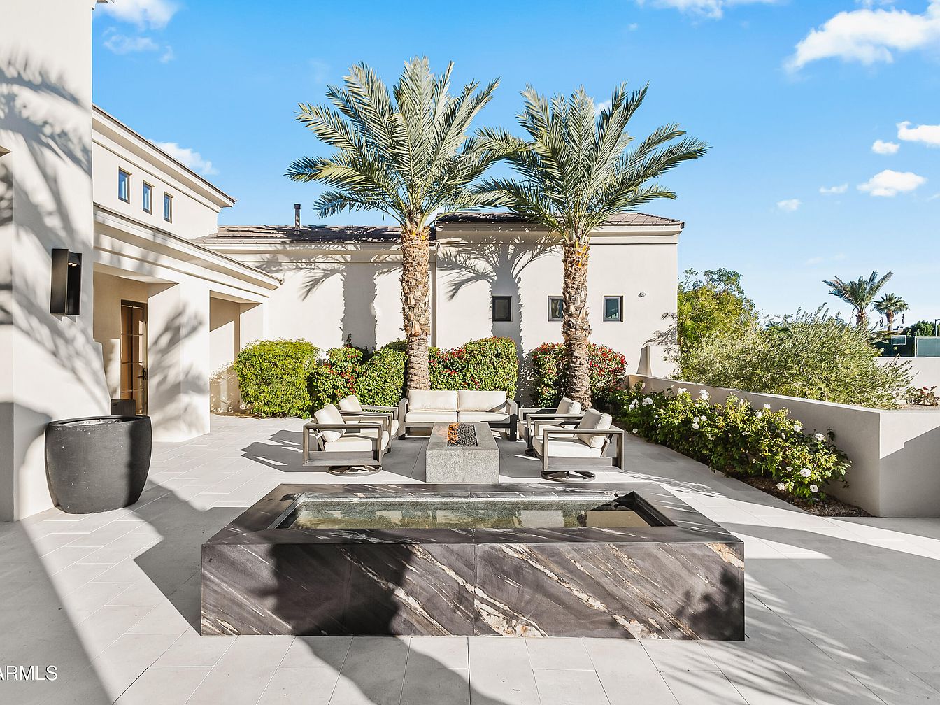 This inviting outdoor living space seamlessly blends comfort and style, ideal for family gatherings. Featuring a modern seating area with plush, neutral-toned cushions, it encourages relaxation beneath the shade of palm trees. A striking stone fire pit serves as a focal point, surrounded by sleek, low-profile furniture, creating an engaging atmosphere. The patio’s clean lines and expansive gray tiles enhance the minimalist aesthetic, while lush greenery adds warmth and vibrancy. The thoughtful layout allows for easy movement, fostering a welcoming environment for socializing and enjoying the outdoors, perfect for making lasting memories with loved ones.