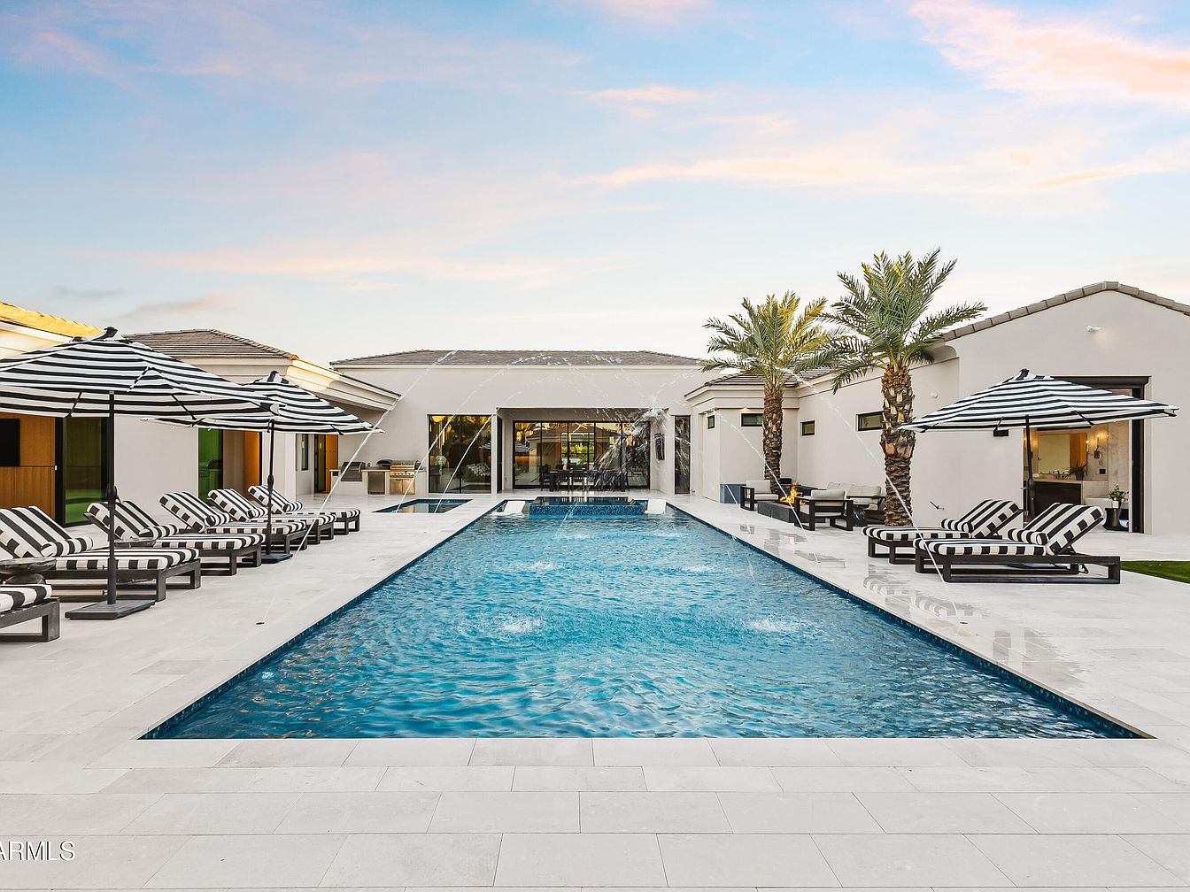 This stunning outdoor space features a large, inviting swimming pool framed by sleek, contemporary tiles. Sun loungers with stylish striped cushions provide a perfect place to relax under the shade of matching umbrellas. The layout promotes family gatherings, with ample seating areas and a direct view of the home’s expansive glass doors leading inside. The neutral color palette of soft whites and subtle grays enhances the serene atmosphere, while palm trees offer a tropical touch. Water features add an element of tranquility, making this outdoor oasis ideal for leisurely afternoons and entertaining guests.