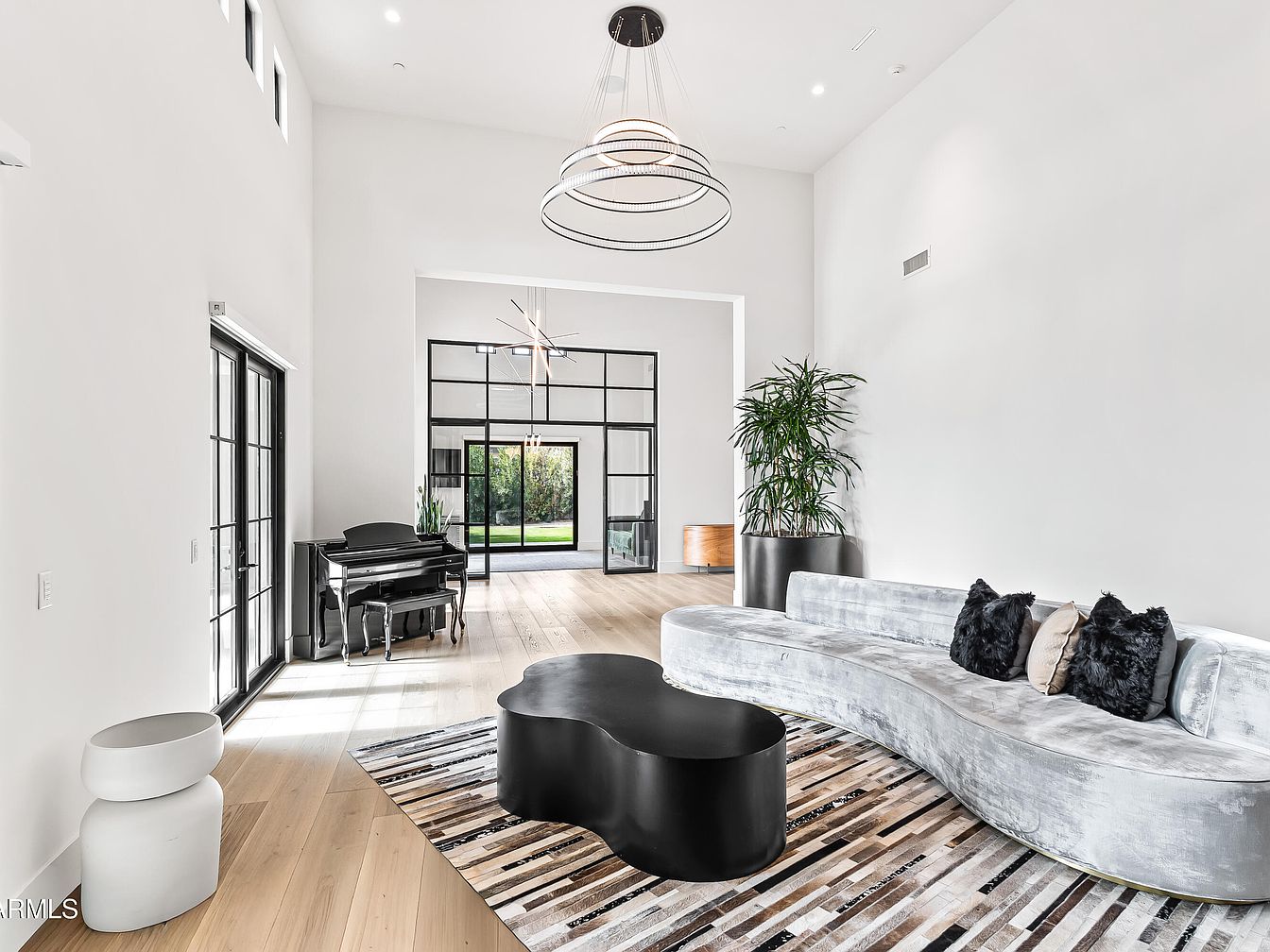 This spacious living area features a contemporary design, highlighted by soaring ceilings and an abundance of natural light. The sleek, curved grey sectional provides a perfect spot for relaxation, adorned with plush pillows for added comfort. A unique black coffee table contrasts elegantly with the warm, blonde hardwood flooring, while a stylish area rug adds texture and visual interest. Floor-to-ceiling windows invite the outside in, showcasing a lush green lawn beyond. The sleek black piano nestled in the corner offers a touch of sophistication, making this space ideal for family gatherings and entertaining guests.