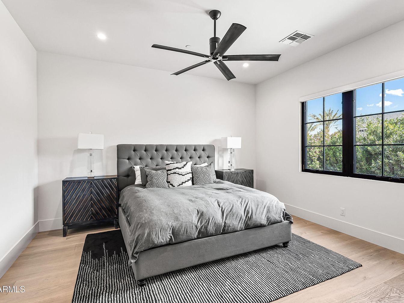 This modern master bedroom combines comfort and sophistication, featuring a plush gray tufted bed as the focal point. The room showcases a minimalist color palette of soft whites paired with rich grays, complemented by warm wood flooring that adds a natural touch. Elegant black nightstands, each topped with sleek lamps, enhance the aesthetic while providing essential functionality. Large windows invite natural light, offering scenic views and a refreshing atmosphere. The layered textiles from the bed’s decorative pillows to the stylish area rug create a cozy ambiance, perfect for relaxation. Architectural details, like the ceiling fan, add a contemporary flair.