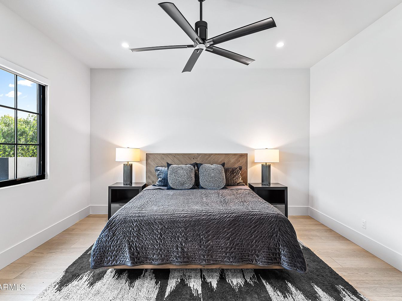 This master bedroom features a minimalist design that exudes tranquility. A spacious layout is accentuated by a plush, king-sized bed dressed in a rich charcoal quilt, pairing beautifully with dark wood nightstands flanking each side. Modern table lamps provide soft, warm illumination, enhancing the serene atmosphere. Large windows invite abundant natural light, framed by sleek black grids, allowing the outdoors to connect seamlessly with the interior. A textured area rug adds a touch of warmth to the light wood flooring. The ceiling fan ensures comfort, while the white walls create a fresh backdrop, making this space ideal for restful retreats.