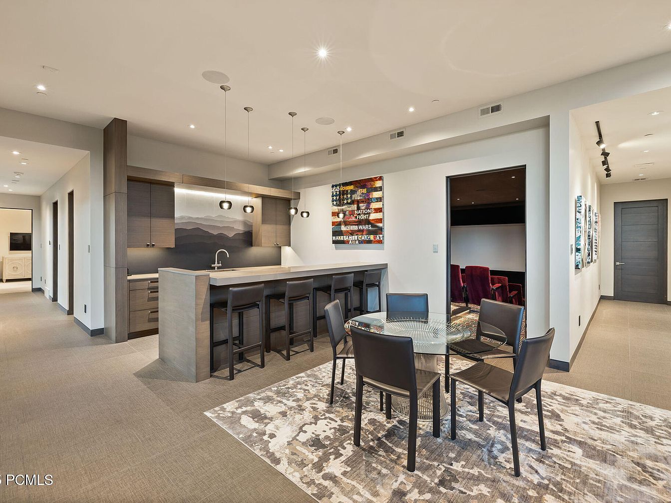 A spacious open-concept entertainment lounge features a modern kitchenette with sleek cabinetry, a minimalist backsplash, and pendant lighting above the extended bar area complete with stylish stools. Adjacent, a contemporary glass dining table sits atop a textured area rug, perfect for family gatherings or game nights. The space offers easy access to a home theater with plush red seating, promoting family-friendly movie nights. Neutral tones, from the soft taupe flooring to the off-white walls, create a calming backdrop, balanced by vibrant pop art and tasteful architectural details. Ample seating and open flow encourage comfort and togetherness for all ages.