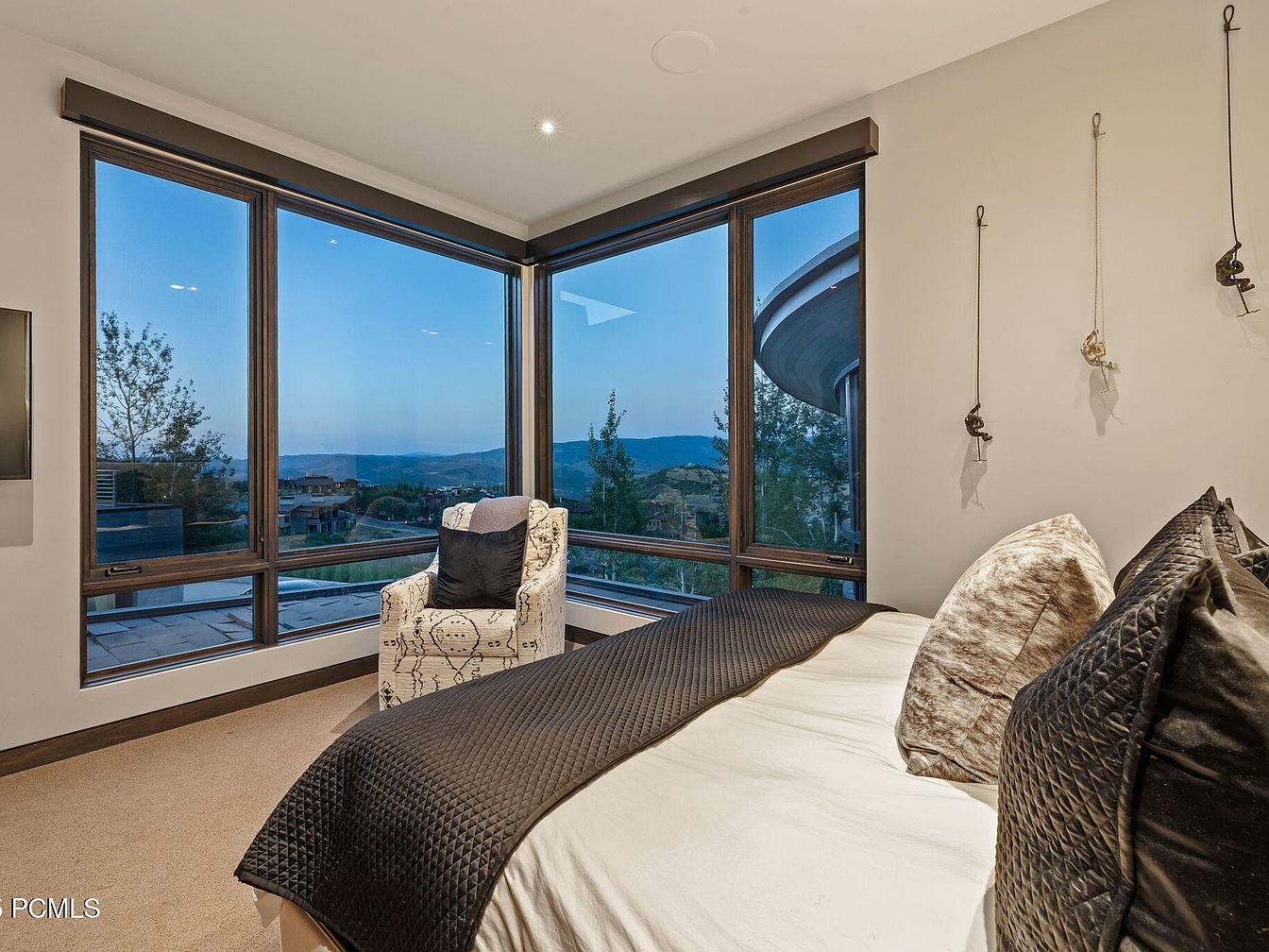 A serene bedroom corner features expansive floor-to-ceiling windows that flood the space with natural light and offer breathtaking mountain vistas, perfect for relaxing or enjoying family moments. The modern layout incorporates a cozy seating nook with a patterned armchair and a soft decorative pillow, inviting both quiet reading and family bonding time. Neutral tones, warm beige carpeting, and crisp white walls form a calming palette enhanced by plush bedding in soft creams and deep charcoals. Minimalist wall hooks add a functional yet stylish accent, while clean architectural lines and open views create an airy, welcoming retreat for all ages.