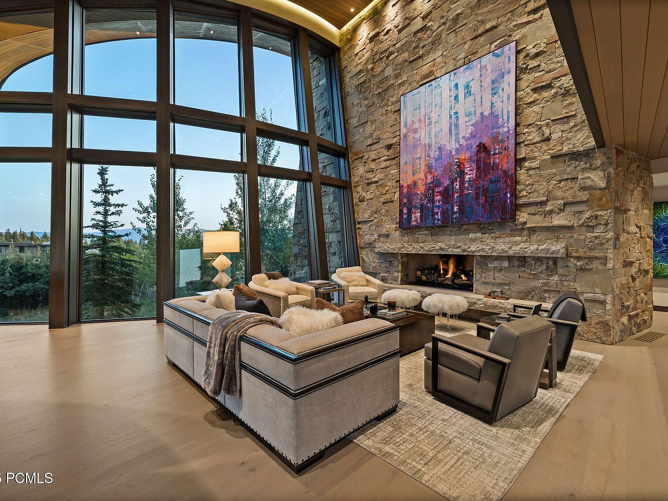 Expansive floor-to-ceiling windows frame breathtaking views and flood the room with natural light, creating a serene yet dramatic atmosphere. Elegant stonework covers the towering fireplace wall, adorned with vibrant contemporary art, offering a warm and inviting focal point for gatherings. Plush seating with a mix of soft, cozy fabrics and modern leather chairs provides comfort for the whole family, while fluffy accent stools add playful texture. A neutral palette of grays, creams, and taupe grounds the space, contrasted by wood details in the ceiling and flooring, making this area visually stunning yet welcoming for both everyday moments and special occasions.