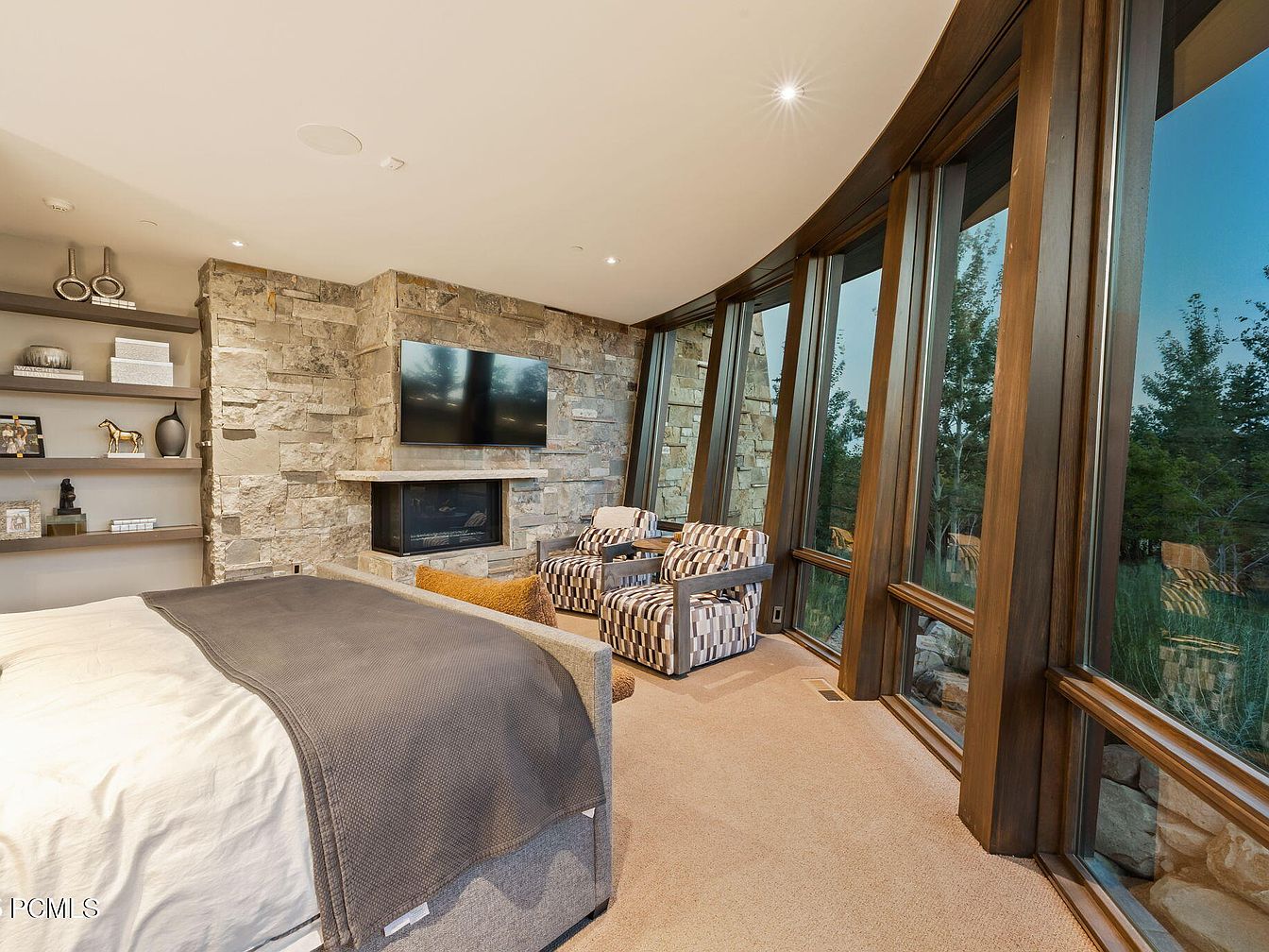 Expansive floor-to-ceiling windows wrap around the master bedroom, inviting in natural light and offering breathtaking views of the landscape. The room features a calming, neutral color palette with soft beige carpet and a cozy gray bedspread. Stonework on the accent wall adds rustic charm while the sleek built-in shelves provide space for decorative pieces and family mementos. A modern fireplace sits beneath a wall-mounted TV, creating a comfortable spot to unwind. Two patterned armchairs form a perfect reading or conversation nook, making the space warm, inviting, and ideal for families looking to gather and relax in comfort.