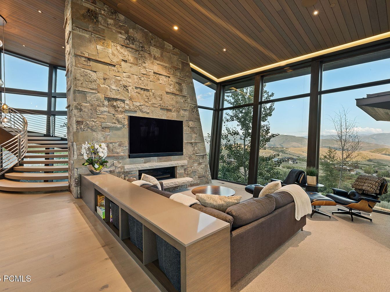 A stunning living room pairs grandeur with warmth, featuring floor-to-ceiling windows that flood the space with natural light and provide breathtaking views of rolling hills. The focal point is a monumental stone fireplace wall with a mounted TV, complemented by modern wood ceilings with recessed lighting. Furnishings include a plush sectional perfect for family lounging, a soft neutral area rug, and a reading nook with a classic lounge chair. Built-in shelving behind the sofa offers practical storage for games or books, blending family-friendly function with sophisticated, earthy tones for an inviting, open-concept gathering space.
