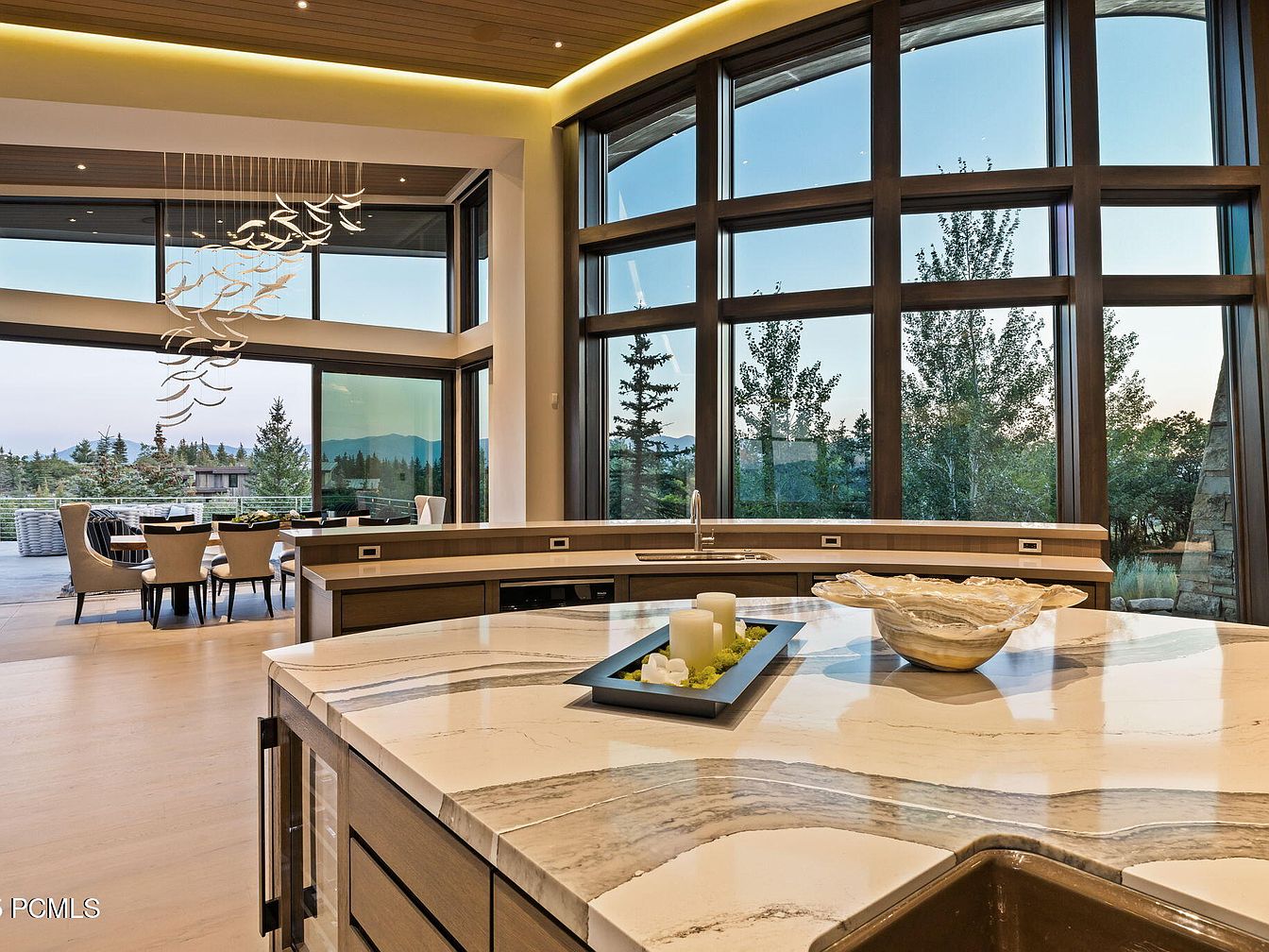 A grand open-concept kitchen featuring a striking marble-topped island with rich wood cabinetry, perfect for family gatherings. Expansive floor-to-ceiling windows flood the space with natural light and frame breathtaking views of the outdoors, seamlessly connecting the interior to the patio. Warm modern tones dominate the space, including creamy marble, honey-toned wood, and bronze accents. A contemporary chandelier hangs over the adjacent dining area, where plush upholstered chairs ensure comfort for both children and adults. Ample counter space, sleek finishes, and the inviting open layout provide an ideal, family-friendly hub for cooking, dining, and entertaining.