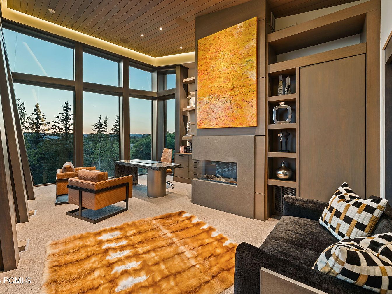 Floor-to-ceiling windows line this sophisticated home office, bathing the space in natural light and providing breathtaking views of the surrounding forest. A blend of modern and cozy aesthetics is achieved with a marble-topped desk and plush armchairs, all in warm neutral tones. The contemporary fireplace adds warmth and a family-friendly atmosphere, while the bold, abstract artwork above it serves as a captivating focal point. Built-in shelves feature artistic decor, keeping surfaces uncluttered, and a luxe, golden-hued faux fur rug invites relaxation or playtime with children. The sleek design, ambient lighting, and smart layout marry productivity with comfort, perfect for work-life balance.
