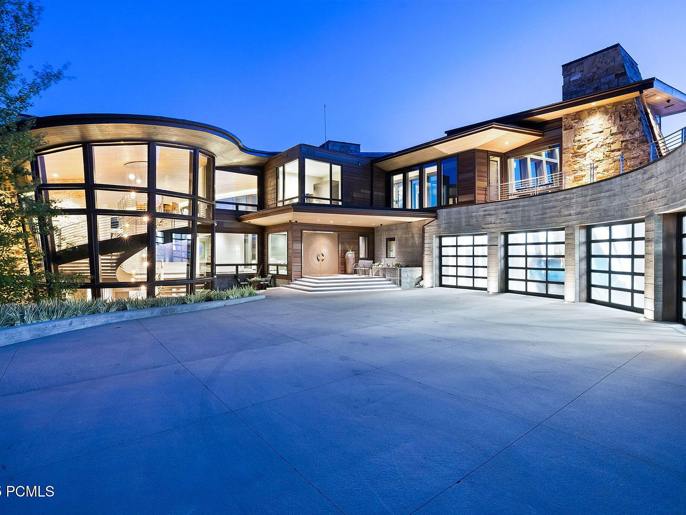 A stunning modern home facade features expansive floor-to-ceiling windows and elegant architectural lines, welcoming residents and guests with a grand entryway. The broad driveway provides ample space for family vehicles, play, or gatherings. The design seamlessly blends wood paneling, stone details, and metal trim, evoking both warmth and sophistication. The multi-level glass garage doors open to a spacious area ideal for storage or hobbies. Soft outdoor lighting highlights natural textures and the curving staircase within, offering an inviting atmosphere perfect for families who entertain or enjoy stylish, open-concept living with a strong connection to the outdoors.