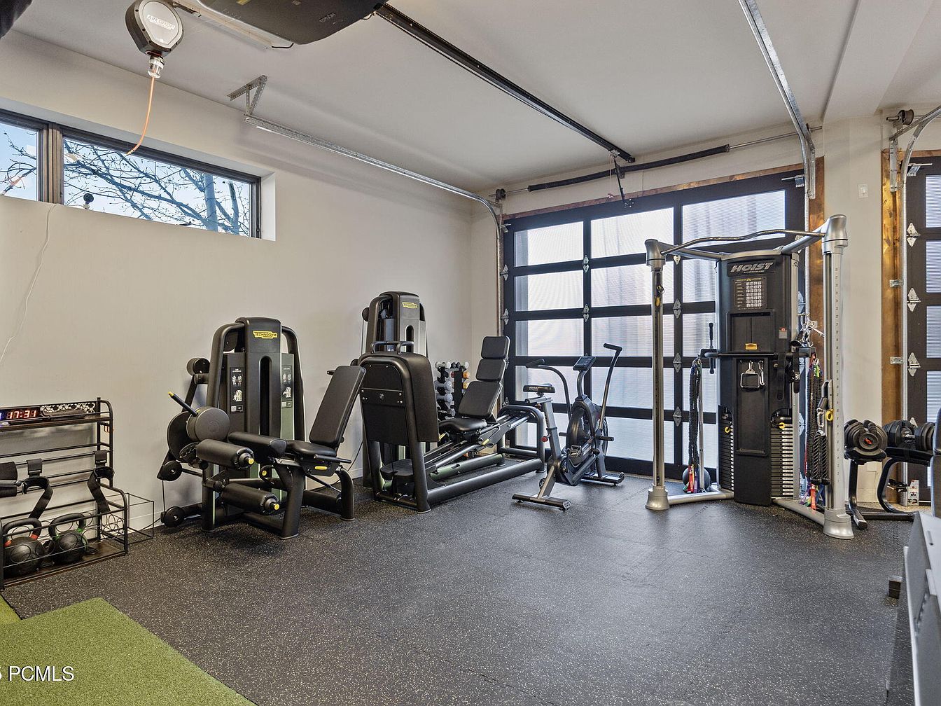 A spacious home gym featuring a sleek, modern design caters to active families and fitness enthusiasts. This area boasts ample natural light from large frosted garage-style doors and high-set windows, creating a refreshing atmosphere that energizes every workout. The gym is equipped with top-tier fitness machines, including weight stacks, an exercise bike, and a multi-functional training station, all placed on durable, traction-friendly rubber flooring. Uncluttered organization is achieved with racks for kettlebells and hand weights, making it safe for multiple users, including teens or adults. The soft gray and black color palette provides a professional yet inviting aesthetic, blending seamlessly into the contemporary home.